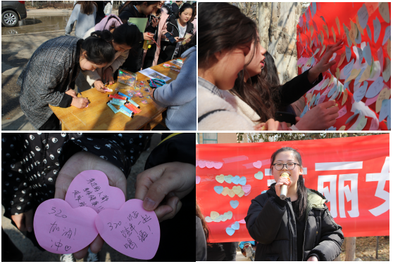在“写出心中愿望与理想”部分活动的准备中,女生将自己的小小心愿、理想或者自己对未来的规划写在便签纸上,贴在“心愿板”上。有的是“希望将来能考上自己理想的学校读研”,有的是“希望自己将来创业成功”,还有的是“希望能交到新朋友”等等一系列各式各样的心愿。来往的同学们在路过心愿板的时候都会驻足停留一番,仔细观看,写下自己内心的心愿,留下了一路的欢声笑语。来往同学自发为女生节献唱。一时间,心愿板上各种各样的心愿都如雨后春笋般冒了出来,也成为春日里诺大的一道明媚的风景线。