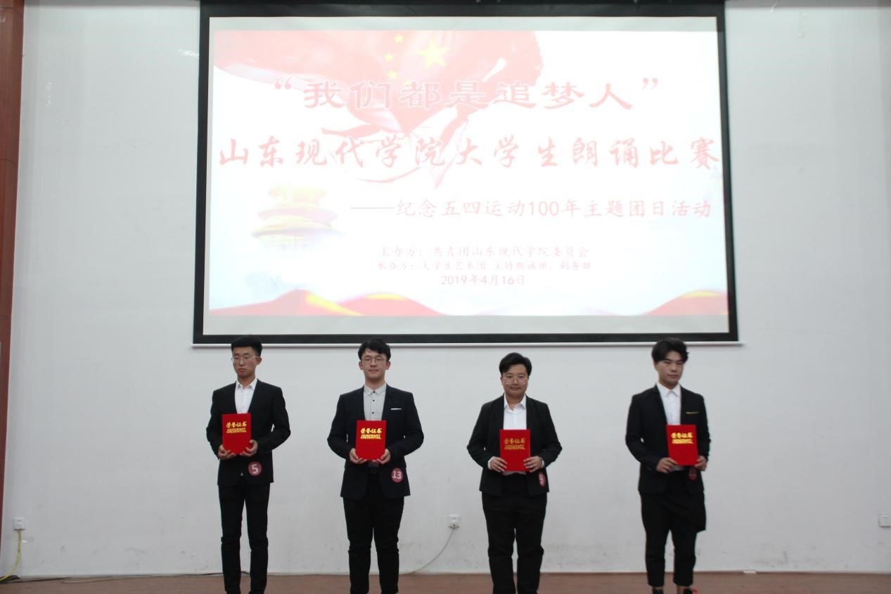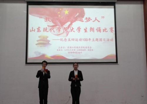 为进一步提高我院学生的文明素质,陶冶学生爱国情操,加强大学生爱国意识,在我校各级领导的带领下,山东现代学院纪念五四100年主题团日系列活动之“我们都是追梦人”大学生朗诵比赛于2019年4月16日中午12:00在科研101报告厅隆重举行。