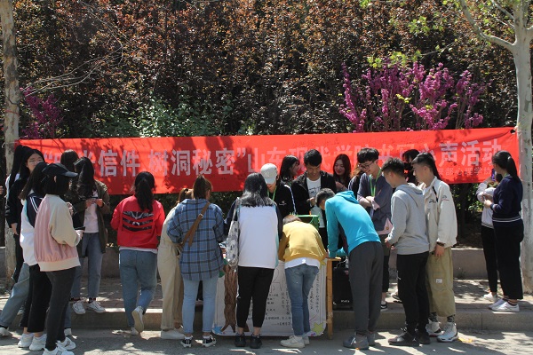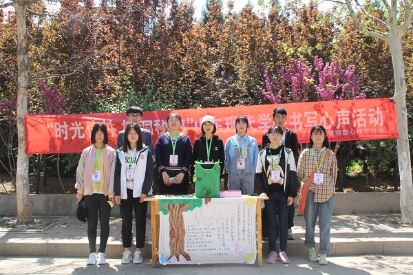 为促进我校大学生心理健康发展,引导学生关心心理健康,以积极心态面对大学生活,由共青团山东现代学院委员会主办,学生社团管理部心理学协会的主题为“时光信件,树洞秘密”的心理学活动于2019年4月11日中午11:00于悯农餐厅和崇俭餐厅之间举行。