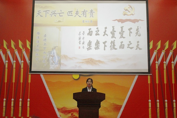 人文学院 丛丽蓉同学:作为新时代的青年,作为共产党的后备军,有着亮丽的青春,如火的激情,美好的未来。新青年的责任是什么?丛丽蓉同学引用文天祥、“从今别却江南日,化作啼鹃带血归”。秋瑾“一腔热血勤珍重,洒去犹能化碧涛。”雷锋的:“我要把有限的生命投入到无限地为人民服务中去”3种观点诠释了青年的责任。