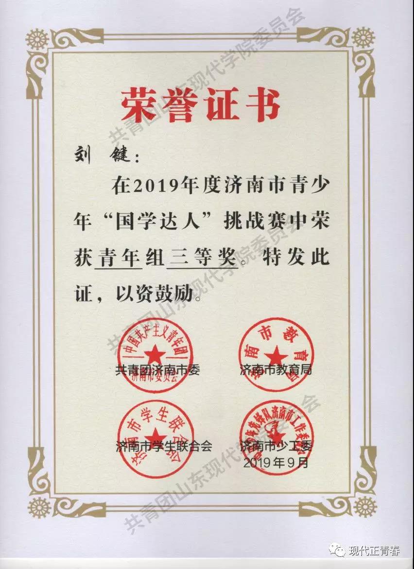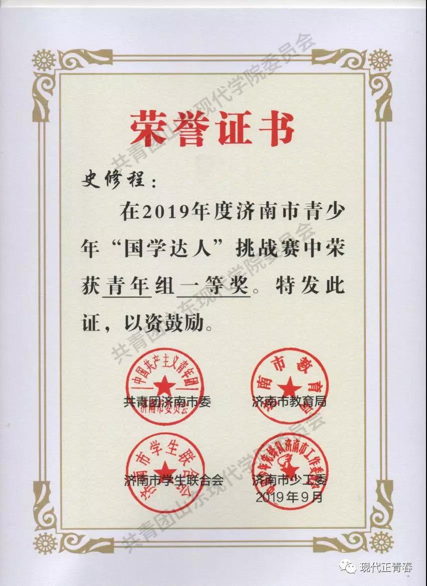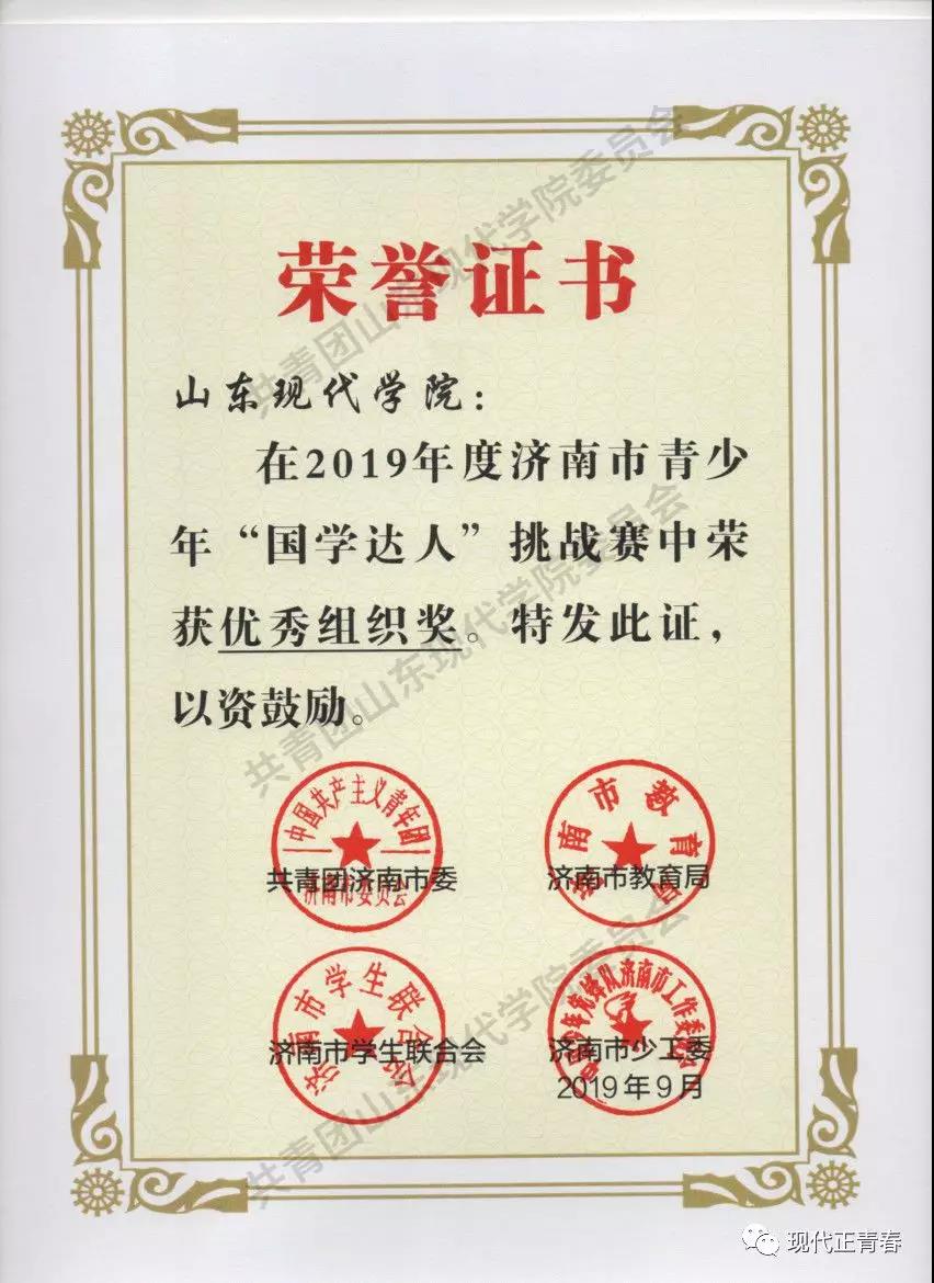 2019年9月7-8日,由共青团济南市委、济南市教育局、济南市学生联合会、济南市少工委主办,济南市府学文庙管理处、济南尔德教育咨询有限公司·夫子书院承办的济南市“国学达人”挑战赛在济南府学文庙进行。通过校内层层选拔,最终选派出山东现代学院校团委国学社的卢东岳、史修程、刘键三名学生代表前往参赛。