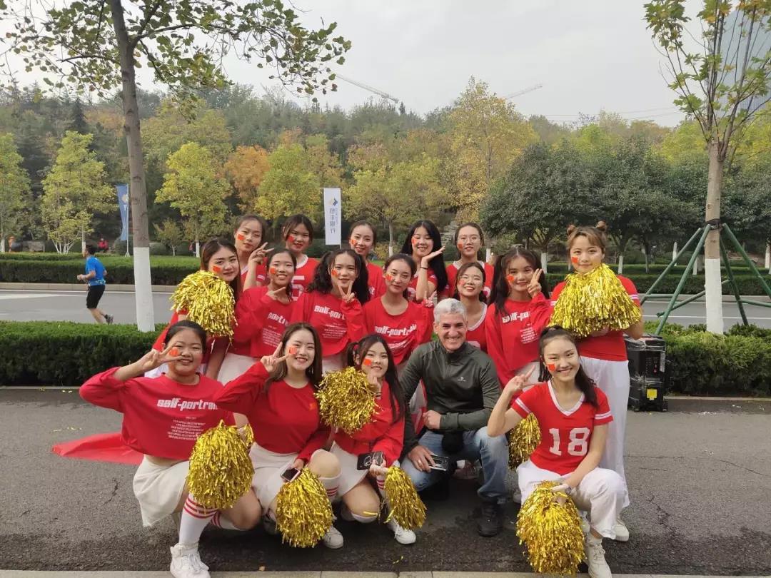 在表演区,她们摇旗,她们呐喊,这些都化为秋日里的暖阳,流入了每个人的心坎,伴随着激昂的音乐,她们翻身跳跃,奔走舞动,展示着高难度的动作,她们用自己的表演,为这一群勇敢奔跑的人助威。