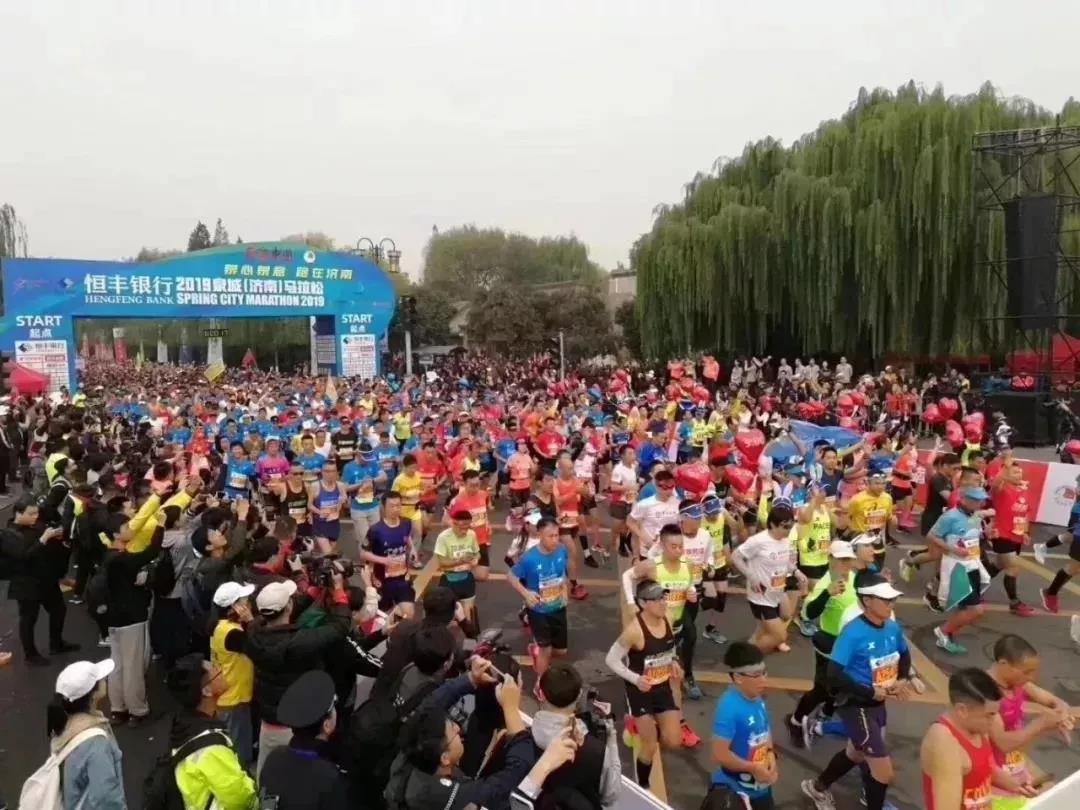 7:30来自国内外的两万名跑者共同穿越深秋的济南,从大明湖南门开跑。