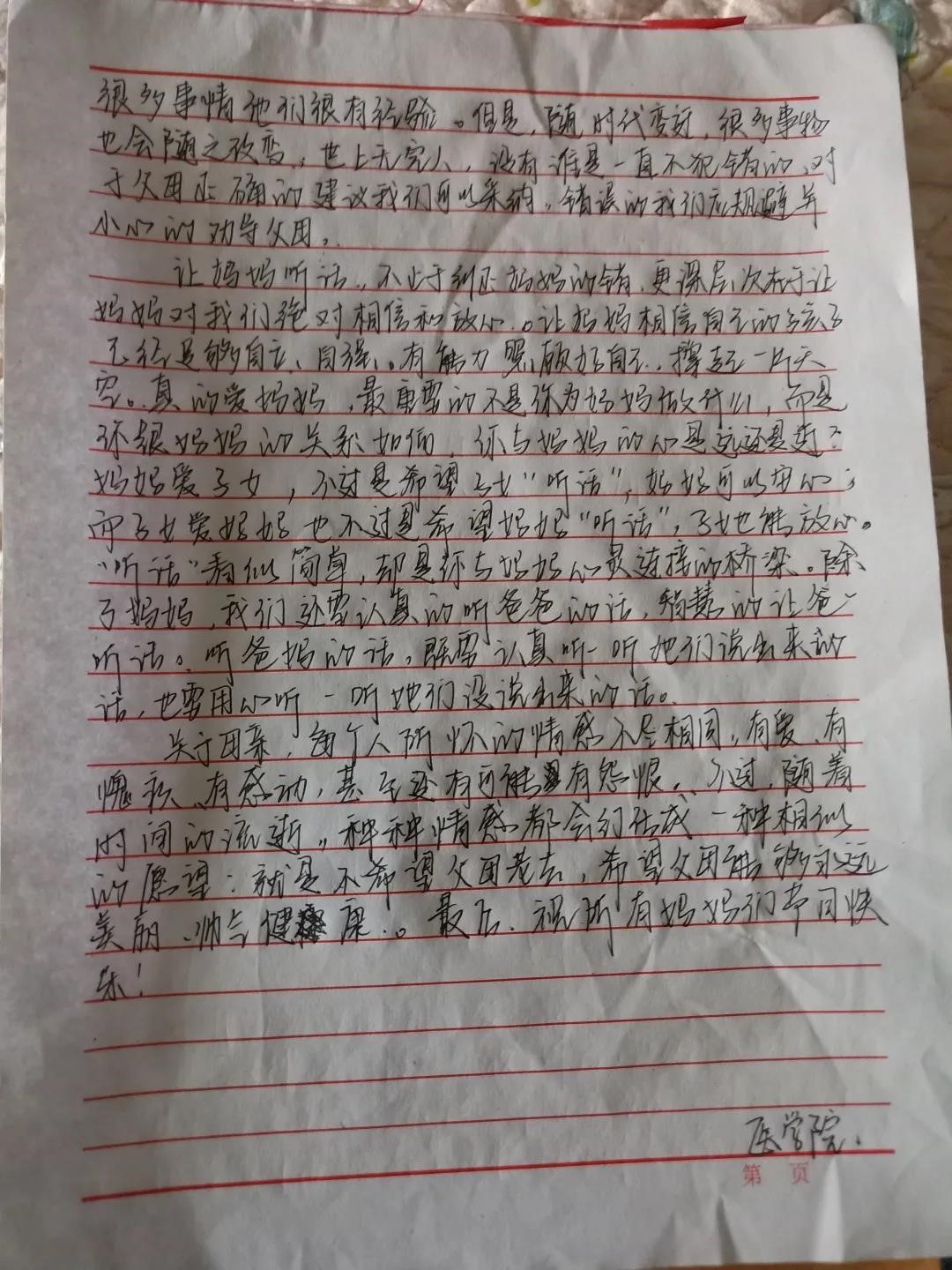 另一个是我最亲爱的妈妈,在妈妈的爱抚下,我们慢慢地长大了。可是她却从来没有要求任何的回报,这是一种多么广博多么无私的爱啊!从古至今,多少文人墨客竭力渲染母爱的伟大,它赐予了我们多少不能忘却的东西,我们从那里得到的远远比付出的多,在母亲那里我们学会了宽容,学会了理解,学会了广博,学会了为他人着想,可是我们又曾为妈妈做过什么呢?妈妈为这家奉献了自己的青春,又着手为我们的未来做努力。做为子女,我们健康成长,平平安安则是对他们最好的回报。