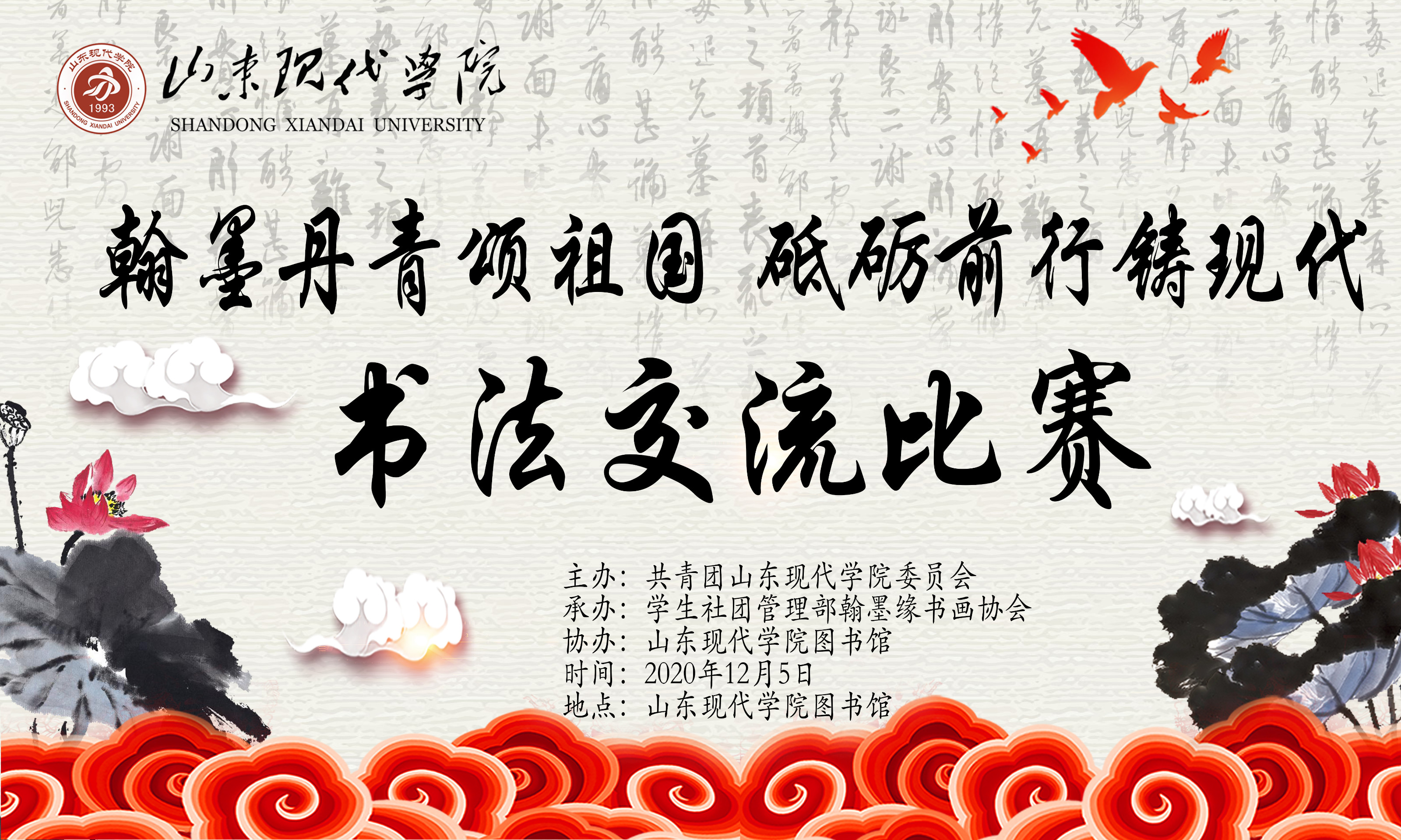 山河壮丽,江山不老,岁月峥嵘,祖国长青。泱泱华夏历经万般磨难,终是雄狮睡起,浴火重生。书画言志,金石寄情,山东现代学院以强国梦为船,中国梦为帆,拼搏奋斗为桨,天道酬勤,砥砺奋进,以期赢得累累硕果。特举办山东现代学院第六届书画展暨驻济各高校书法交流比赛。本次书画展以“翰墨丹青颂祖国,砥砺前行铸现代”为主题,一笔一划,无不是饱含着对祖国走向美好新时代的期盼,一点一滴,无不沉浸着对美好未来的向往追求。