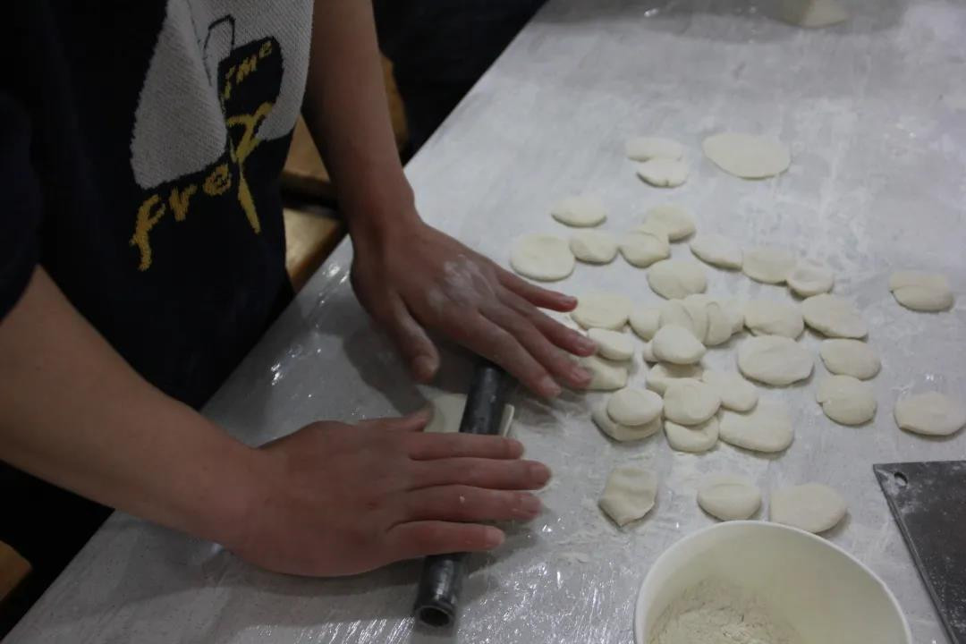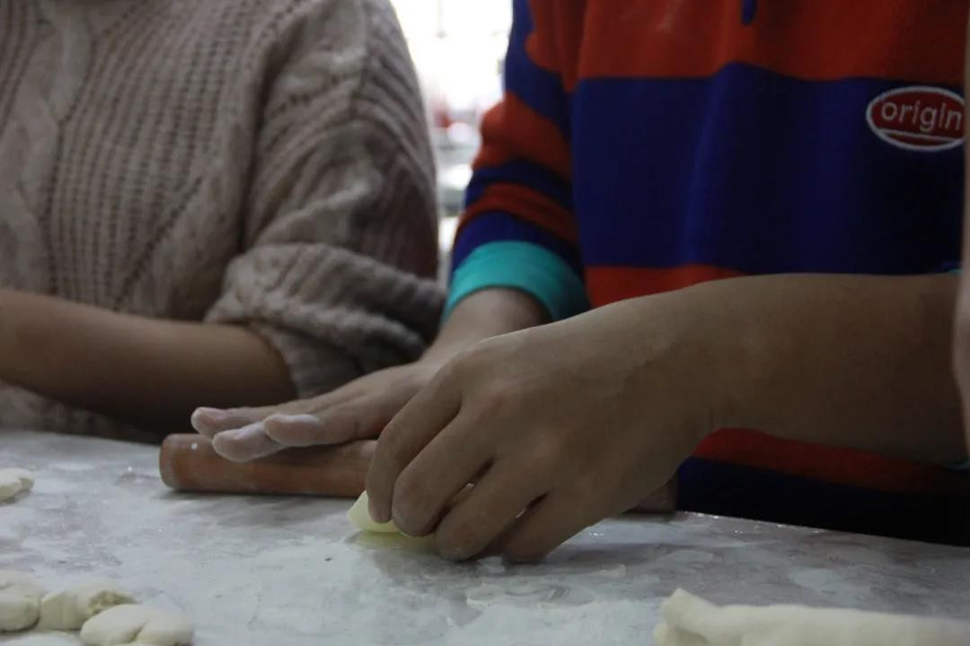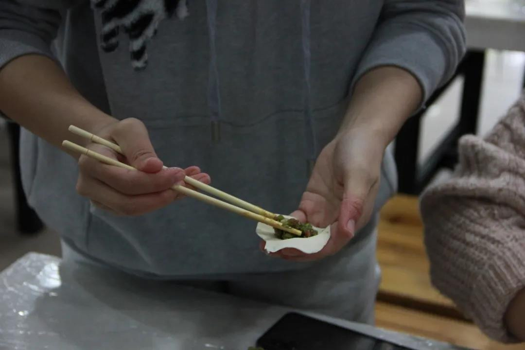 擀面杖、饺子馅和面团准备就绪,主持人宣布活动正式开始。同学们一边忙碌,一边交谈,搓面球、擀面皮、包饺子......老师也加入到同学们中一起包饺子,其乐融融,脸上都洋溢着欢快的笑容。