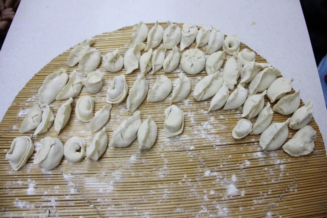 同学们包出来的“饺子”花样繁多,形态各异,有圆的、有长的、有尖的、有扁的、千奇百怪,大家有说有笑地分享着包饺子的经验。