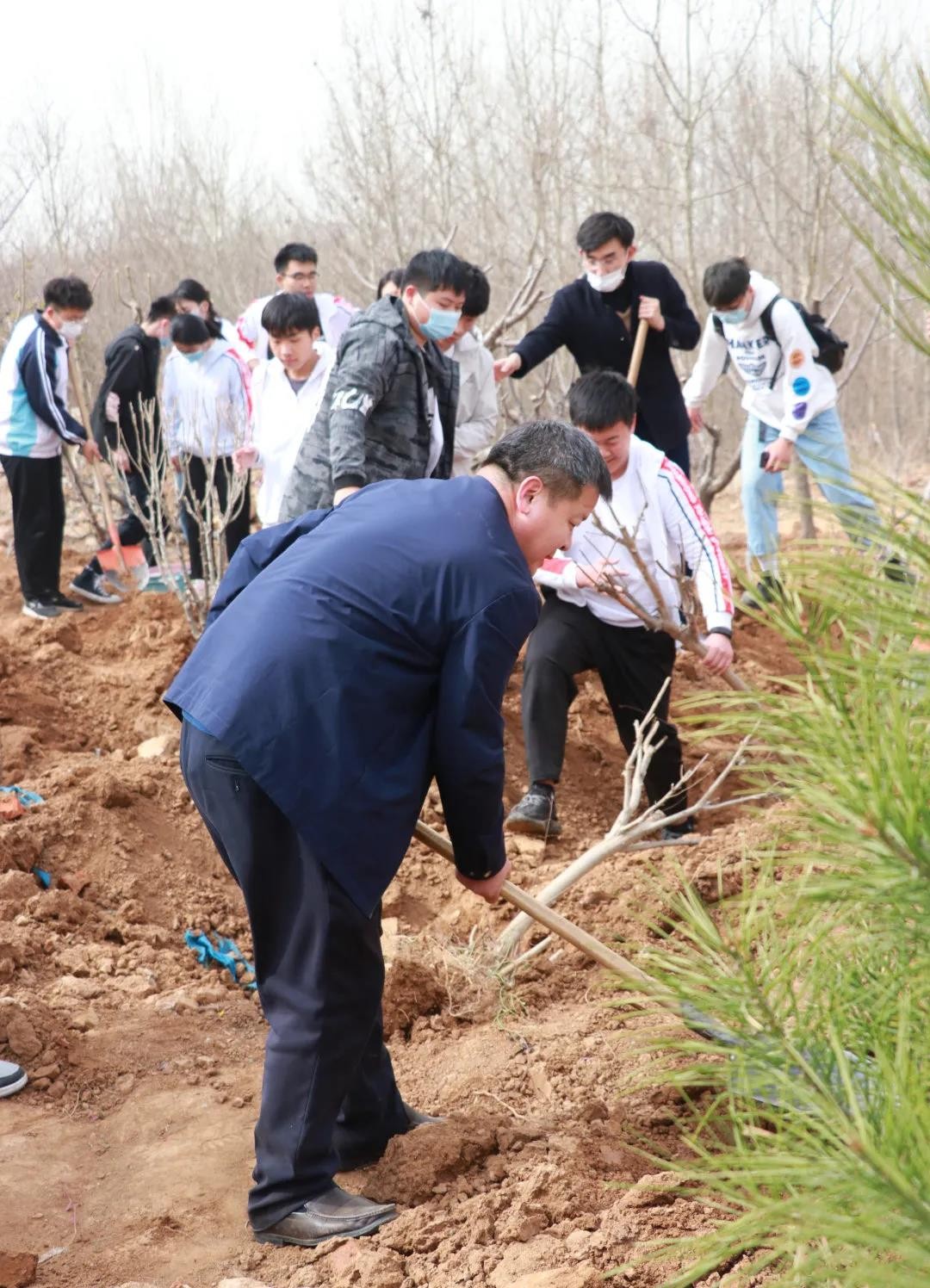 铁锹在同学们的手中变成了有灵性的工具,一棵棵树苗被小心翼翼地放在树坑中,一抔抔泥土被送到树根。