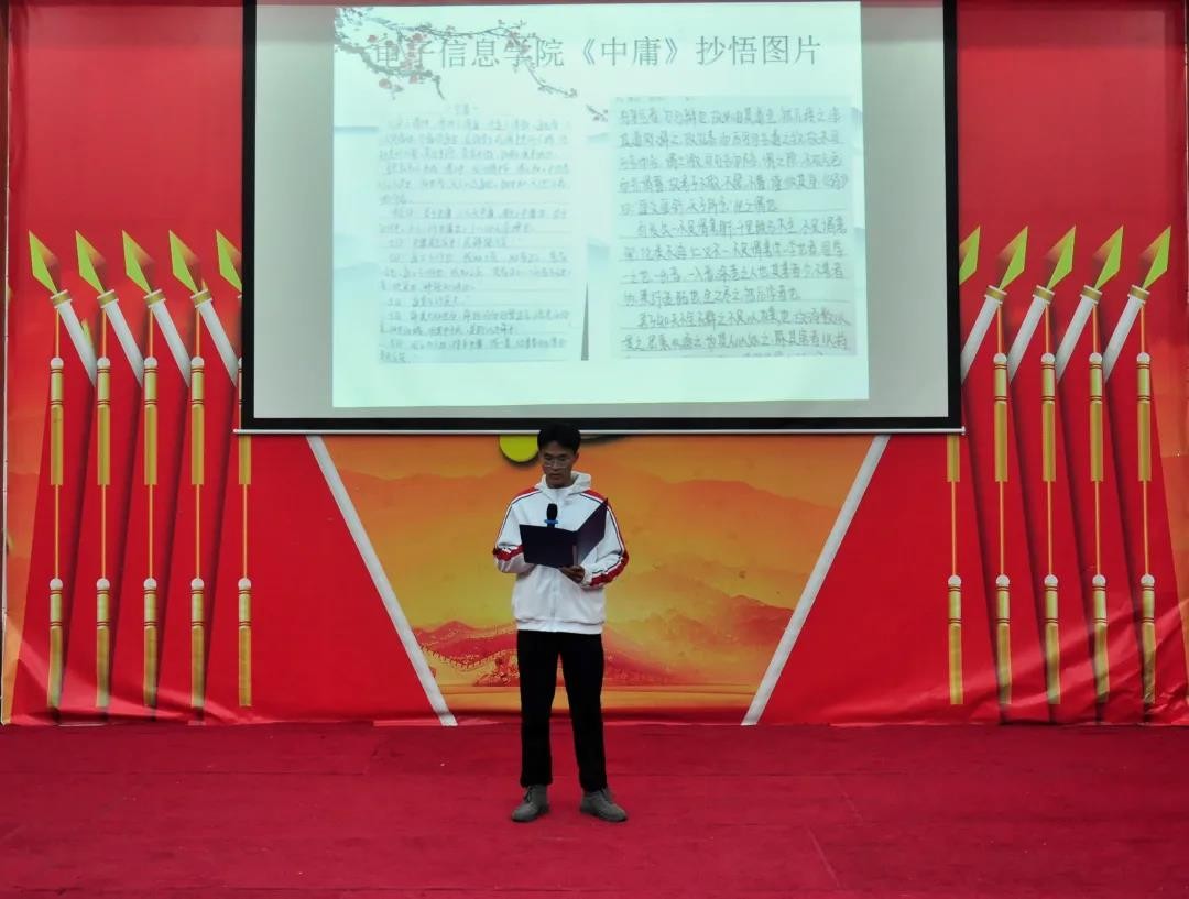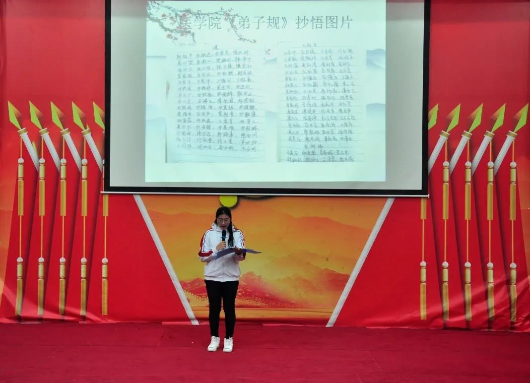 “弟子规,圣人训。守孝悌,次谨信……”简单的三字经就把孝敬父母、关爱兄弟、尊敬师长、修身养性、为人处世等凝练成经典。医学院和技工学校的两位同学带来了《弟子规》的抄悟,与大家一起学习孝亲敬长的美好品德,感悟经典的独特魅力。