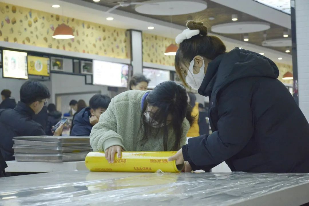 活动正式开始前,工作人员紧锣密鼓地准备着,为保证食材的安全,工作人员将每张活动桌子彻底清理干净并铺上保鲜膜。每位活动参与人员在到场后都需要去清洗间进行洗手杀菌,确保食品安全卫生。