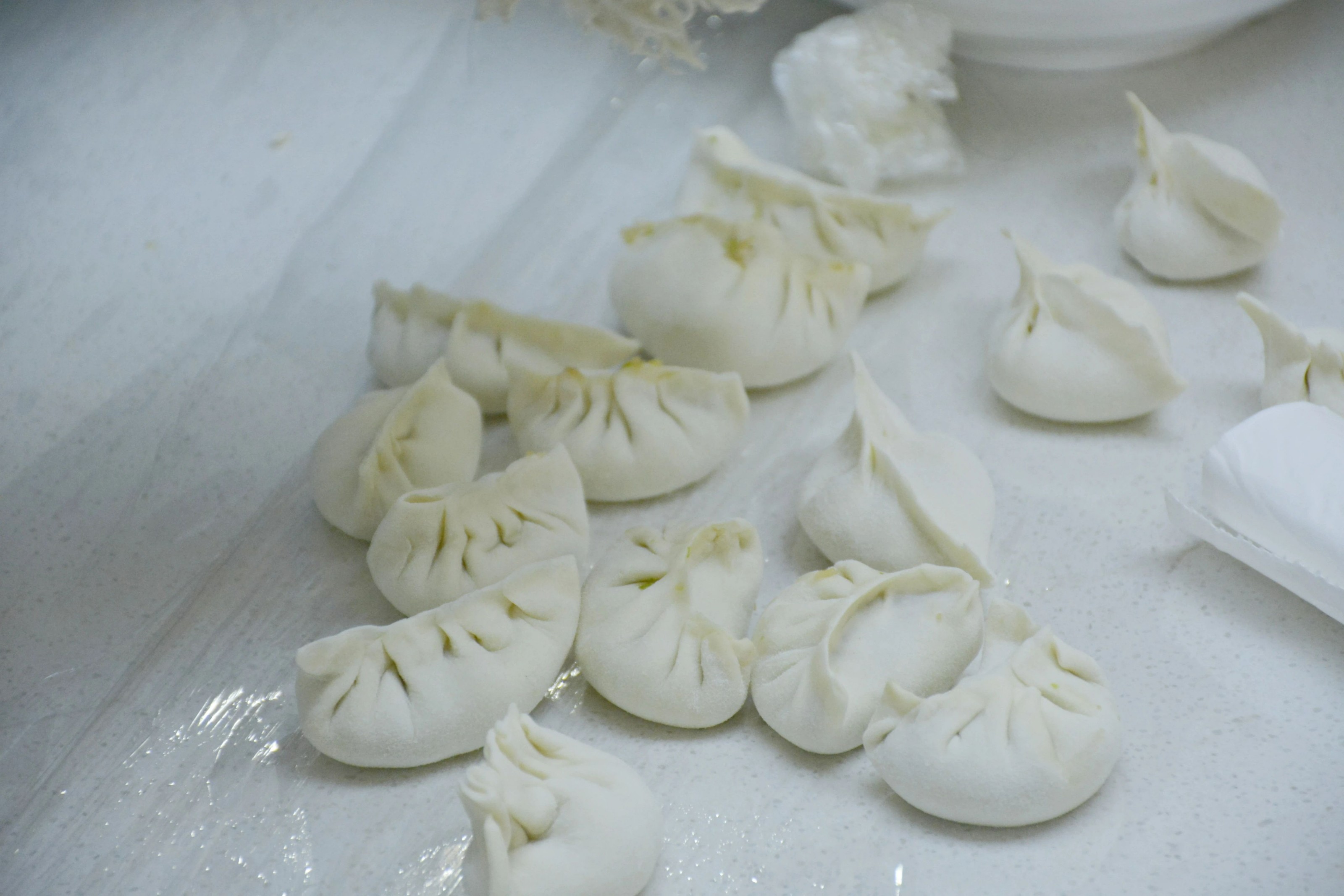 饺子皮上放入满满的馅料,右手食指和拇指托住,将饺子皮对折,然后用左手大拇指和食指将左端边角捏住,左手拇指向内轻推外侧皮,左手食指将外侧皮形成褶折,拇指配合将褶折捏紧,重复步骤至右端饺边并将两端封口处捏牢。十手翻飞间,一轮弯弯的月牙饺子就诞生了。