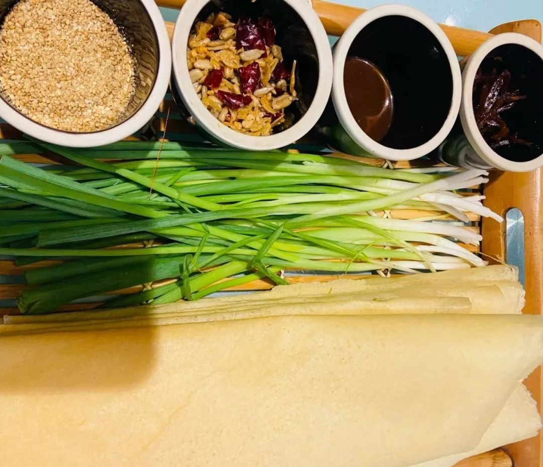 优质的煎饼薄酥香脆,颜色金黄,煎饼卷着洗净的大葱和大酱,辛香辣伴着甜酱的味道,口感筋道,咀嚼鲜香开胃,地域风味十足。除此以外,各种配菜,各种小菜,都可以卷到煎饼里,正所谓万物皆可“卷”。