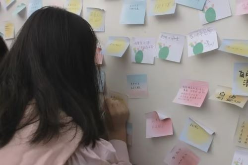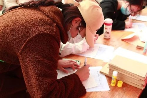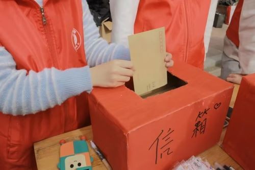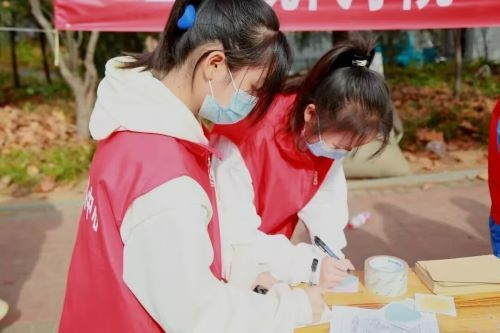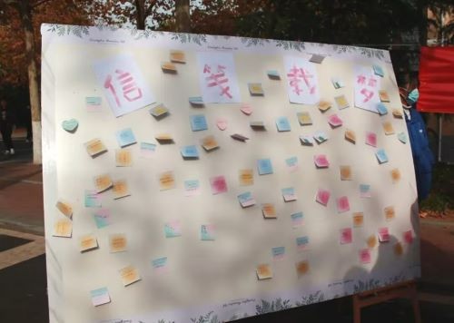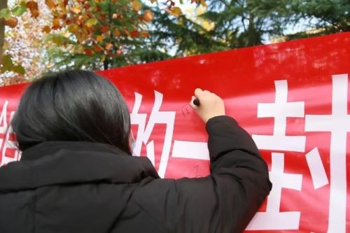 活动过程中,志愿者先是启封并归还去年的信封,然后宣传并讲解活动流程,最后发放新信封并引导同学们在条幅上签名。