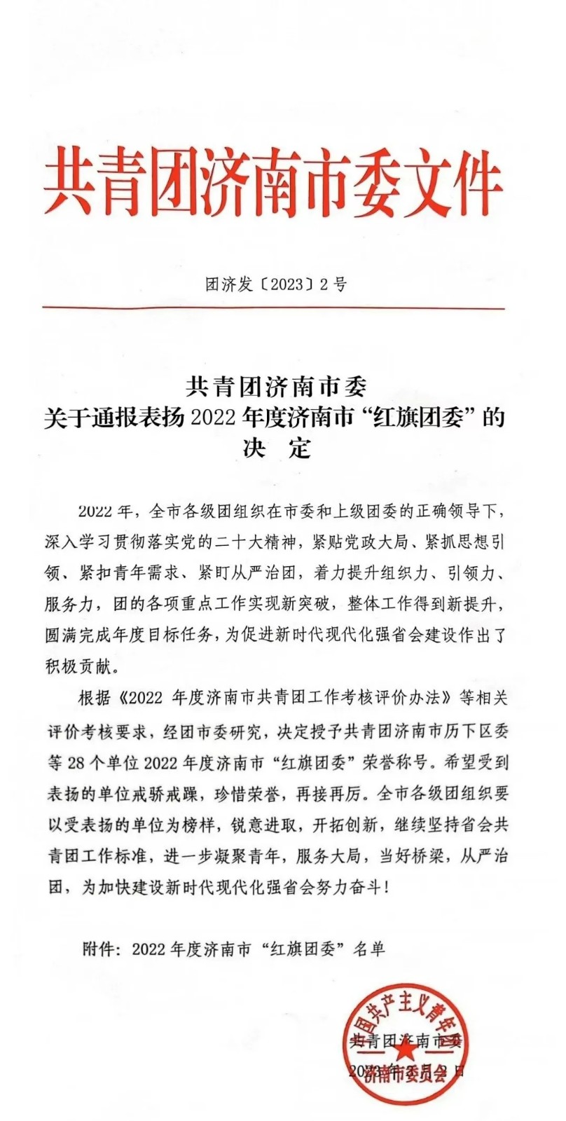 2023年3月2日,我校团委被授予2022年度济南市“红旗团委”荣誉称号,这是共青团济南市委员会授予全市基层团组织的荣誉。