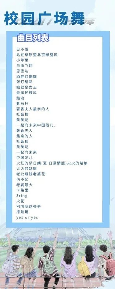 为丰富大学生课余文化生活,推进全民健身运动,营造朝气蓬勃的校园文化氛围,使同学们增强体育锻炼意识,提高身体素质,在运动中收获健康与快乐,引导现代学子走出宿舍,走向操场,洋溢青春活力,我校在新体育场开展校园广场舞活动。