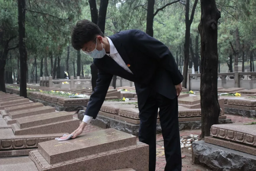 全体成员来到革命烈士墓碑前,向革命烈士鞠躬并擦拭烈士墓碑。向人民英雄致敬,丰碑常在,英雄永驻。