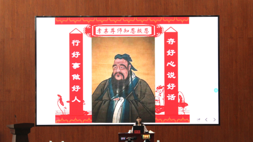 陶老师通过大家熟知的古装剧和汉服引出今天的主题。她讲到,中国礼仪之大,故称夏,有服章之美,谓之华。然后陶老师带领大家学习了拜孔礼,同学们都认真学习,积极配合。