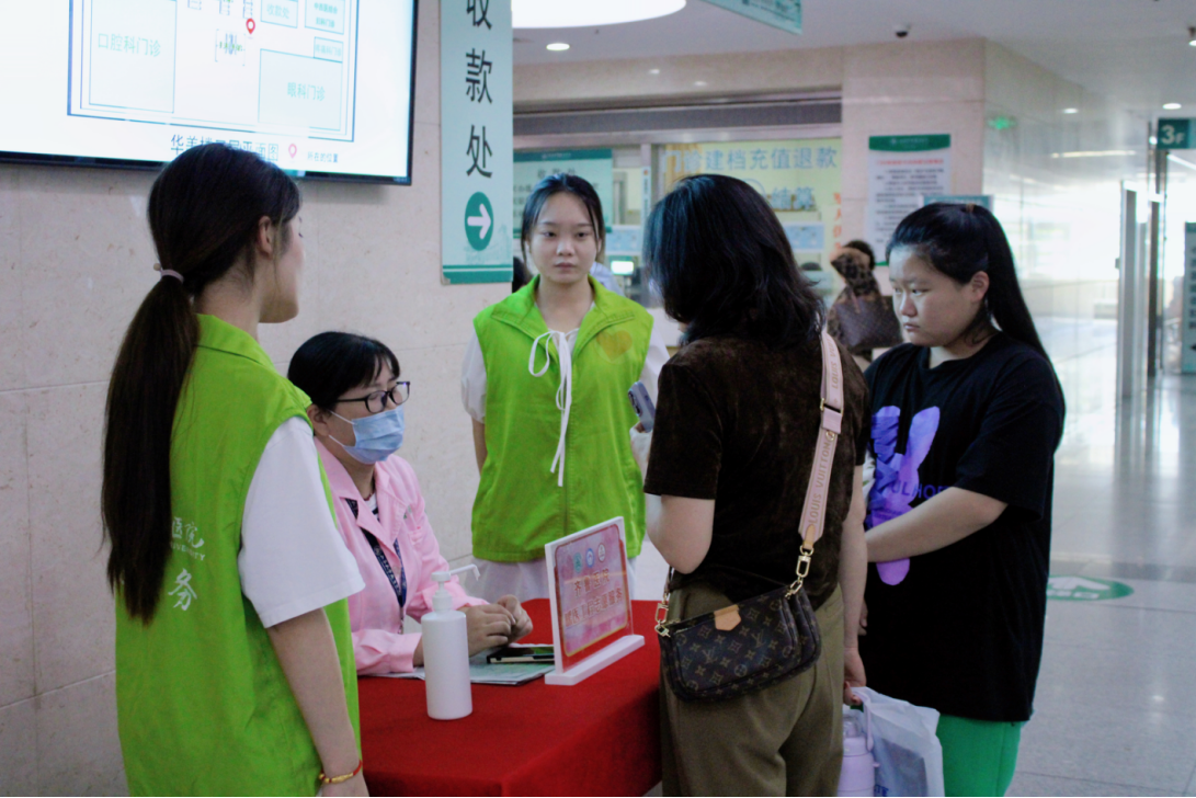 身着志愿服的志愿者们在门诊大厅集合。医院工作人员开始对志愿者们进行本次活动的相关讲解并带领大家熟悉医院环境。