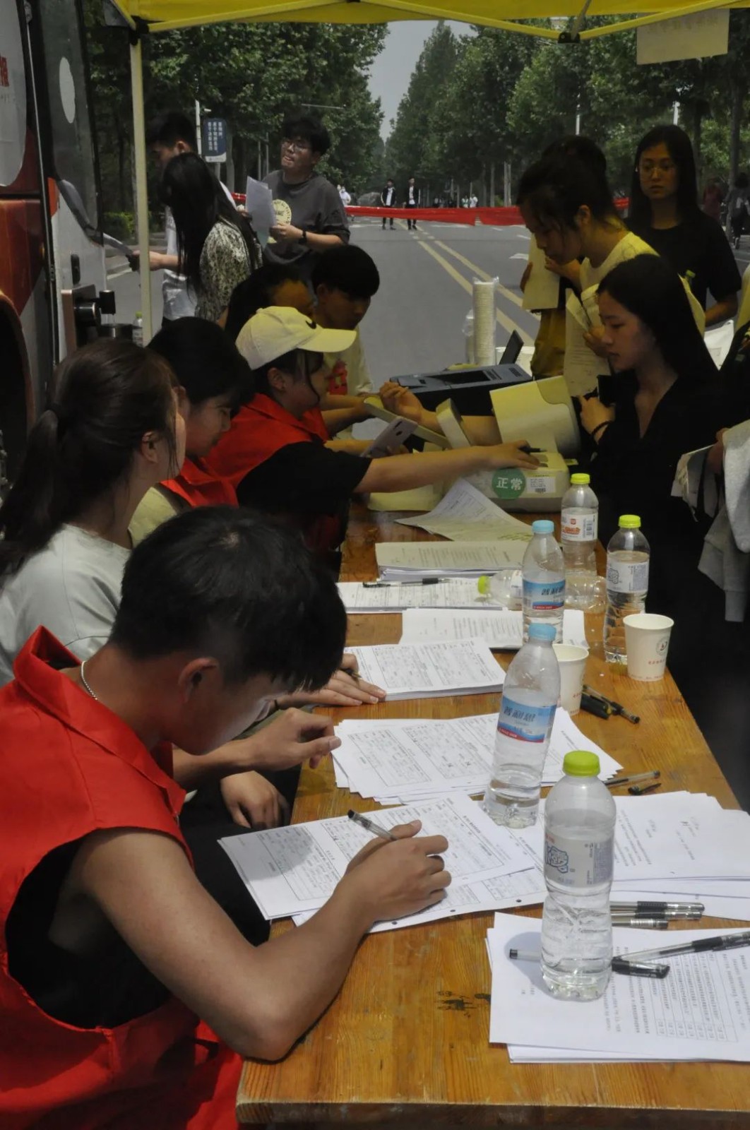 献血车前志愿者们