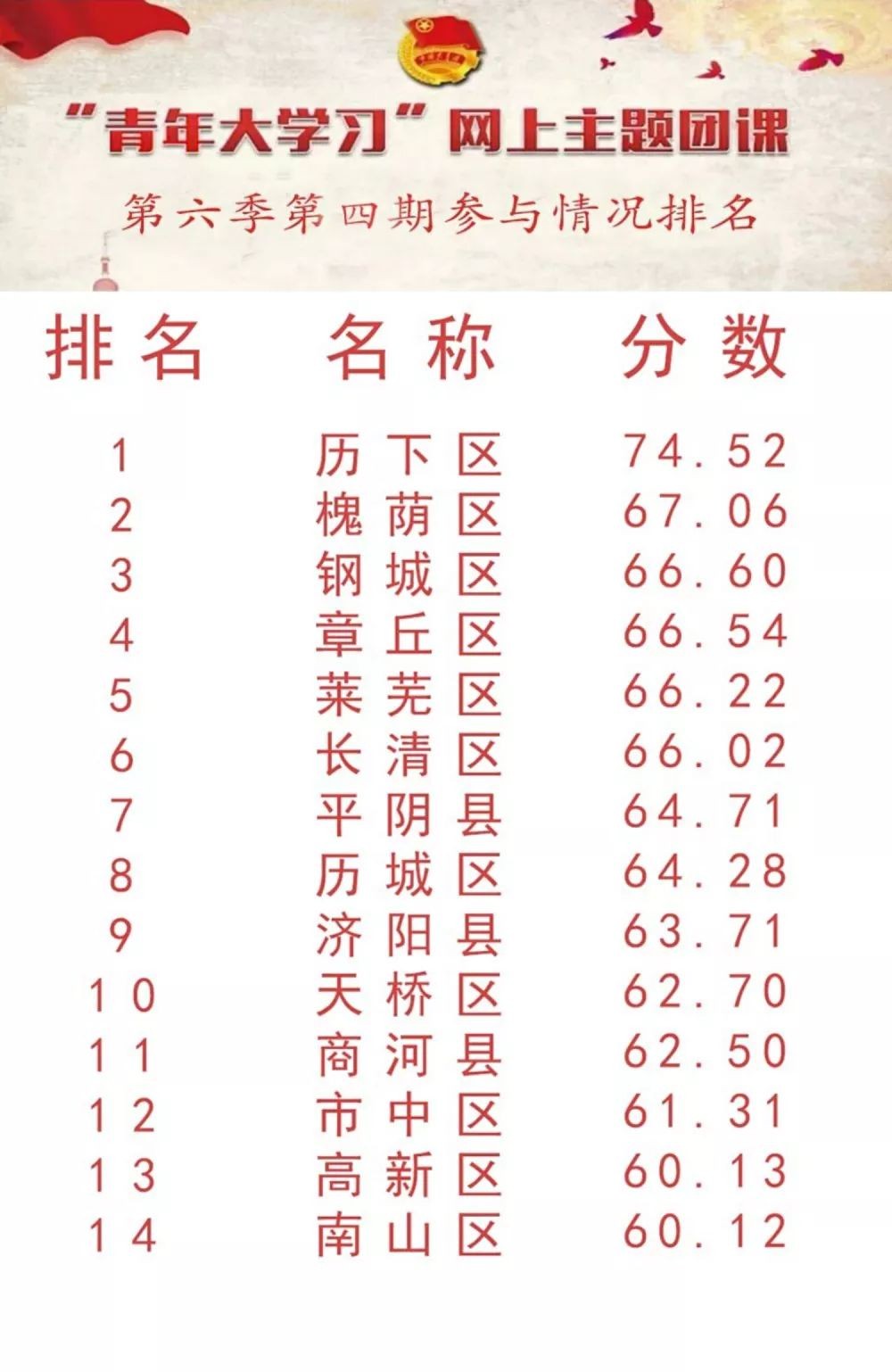 根据数据统计,历下区、槐荫区、钢城区在此次“青年大学习”主题团课中位列前三,章丘区、莱芜区紧随其后,其他各区县虽暂时落后,但希望下次能在榜首看见大家的好成绩哦。