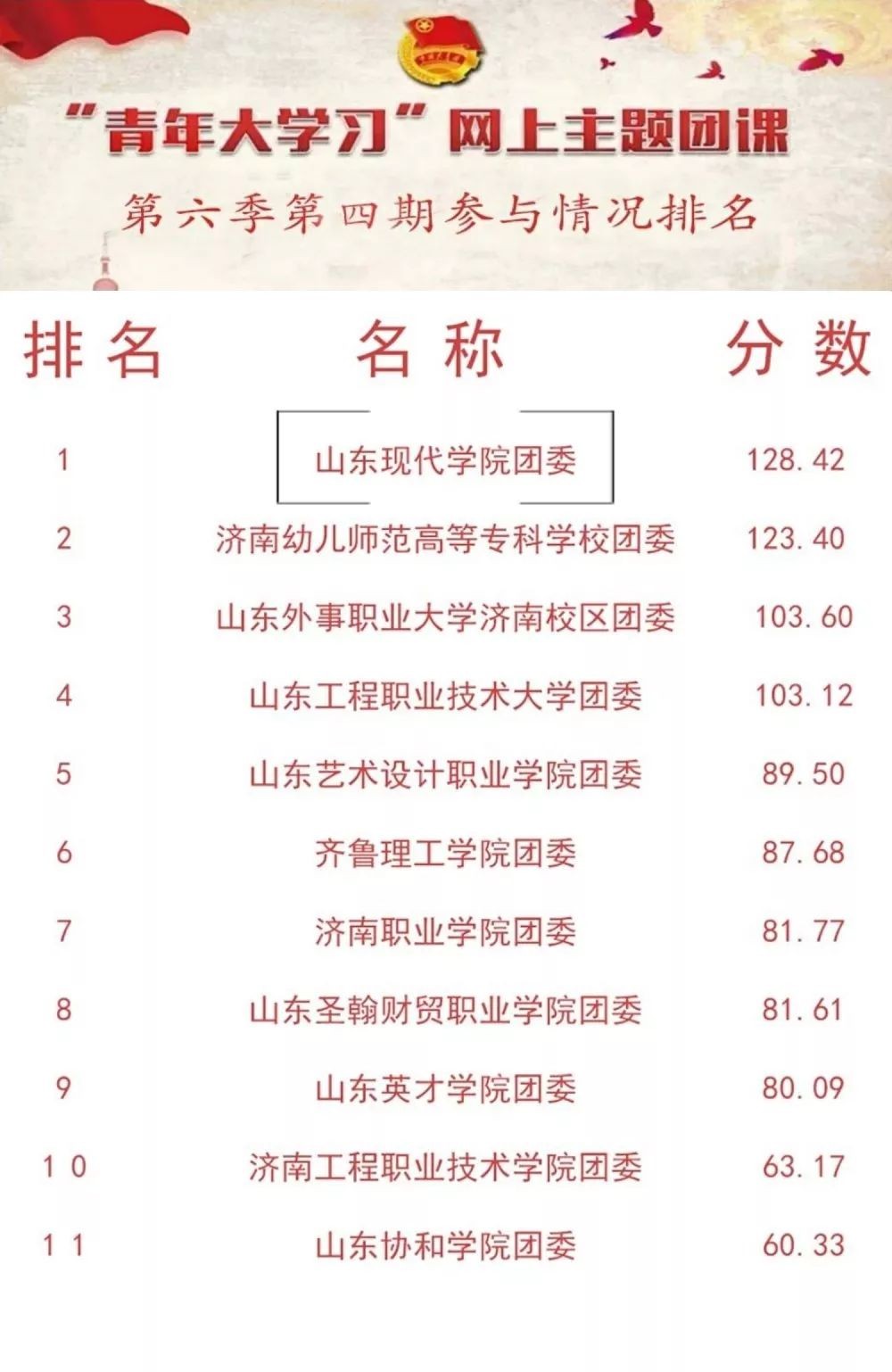 在本次“青年大学习”中,各高校成绩依然不俗,山东现代学院团委、济南幼儿师范高等专科学校团委、山东外事职业大学济南校区团委分数跻身前三!希望各高校团员青年再接再厉,创造新的分数高峰!