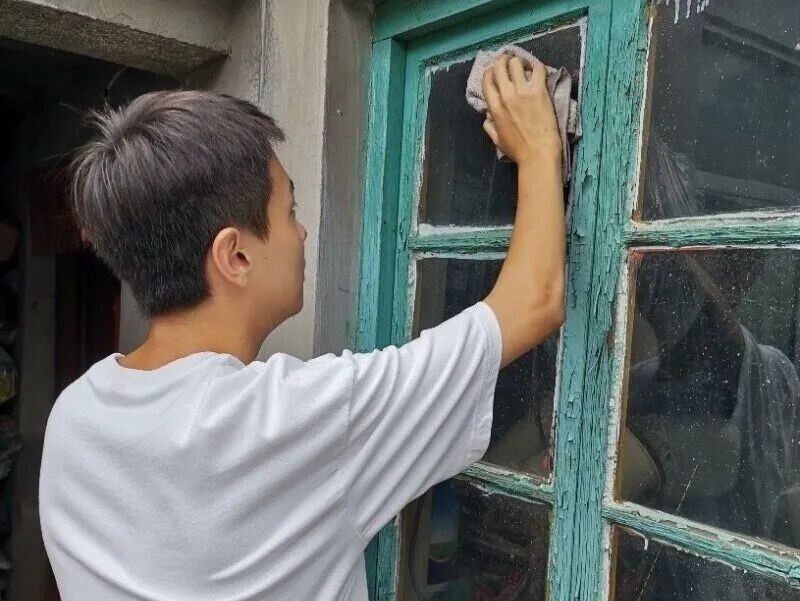 (图为志愿服务队队员在为村民擦玻璃)