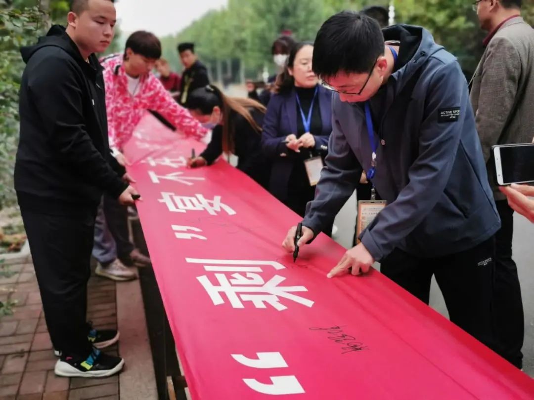 (图为参加光盘行动的领导带头在横幅上签名)