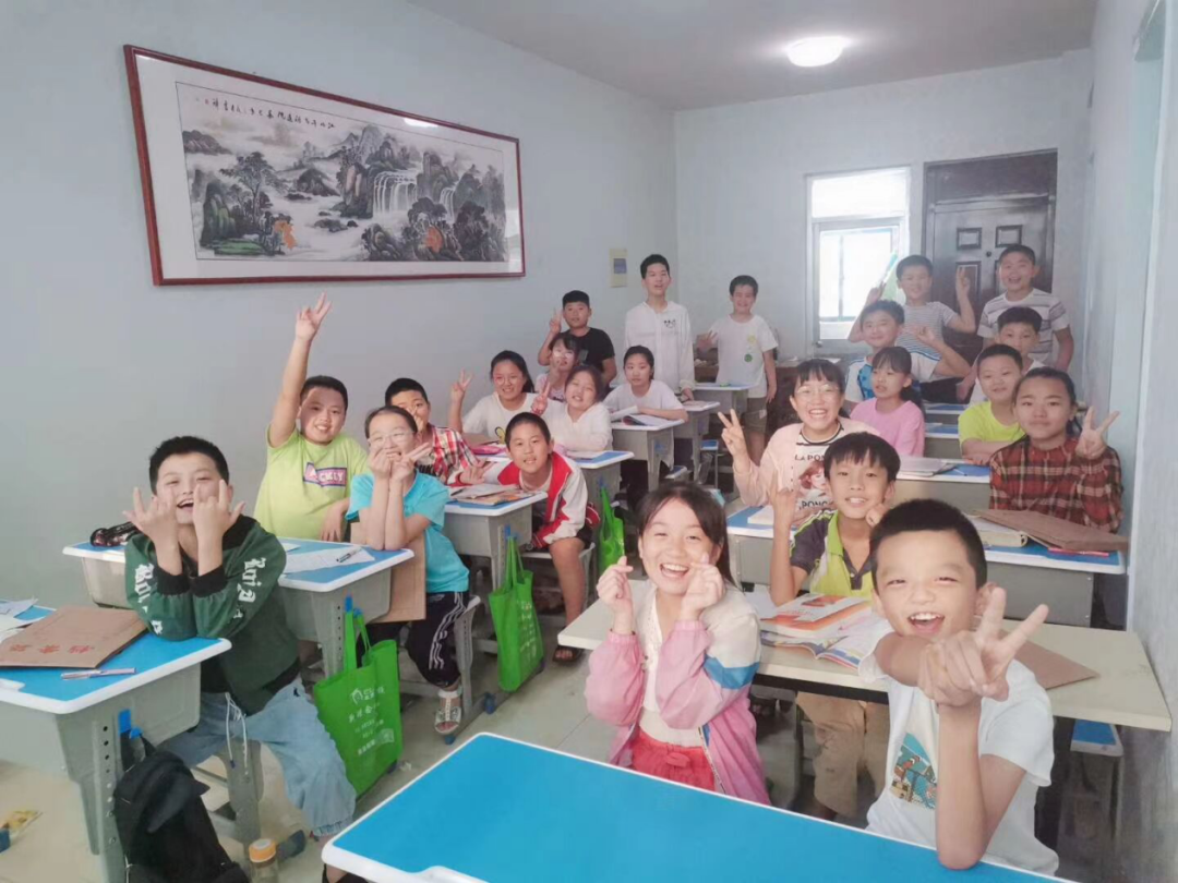 (图为志愿服务队队员社会实践结束时与小朋友们合影留念)