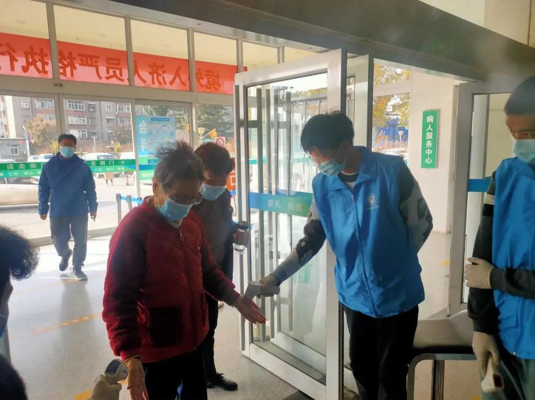 (图为志愿者在为进入医院的人员测温)
