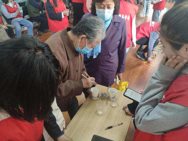 (图为两名同学辅助老人完成夹玻璃球比赛)
