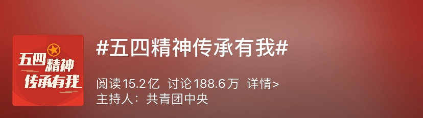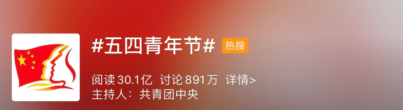 微博上,#五四青年节#话题阅读量达到30.1亿,#五四精神传承有我#话题阅读量达15.2亿。相关话题,先后四次登上微博热搜,直播主题“让青春为祖国绽放”登上微博热搜实时榜,话题#1919年的那个少年#登上微博热搜榜单第二名。