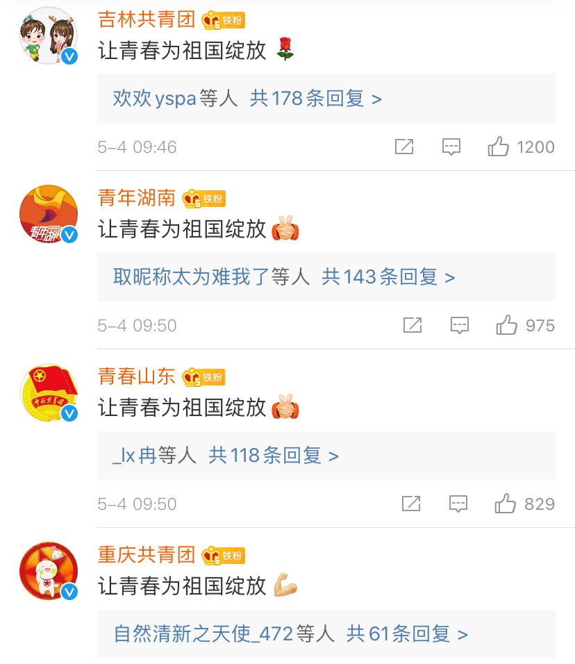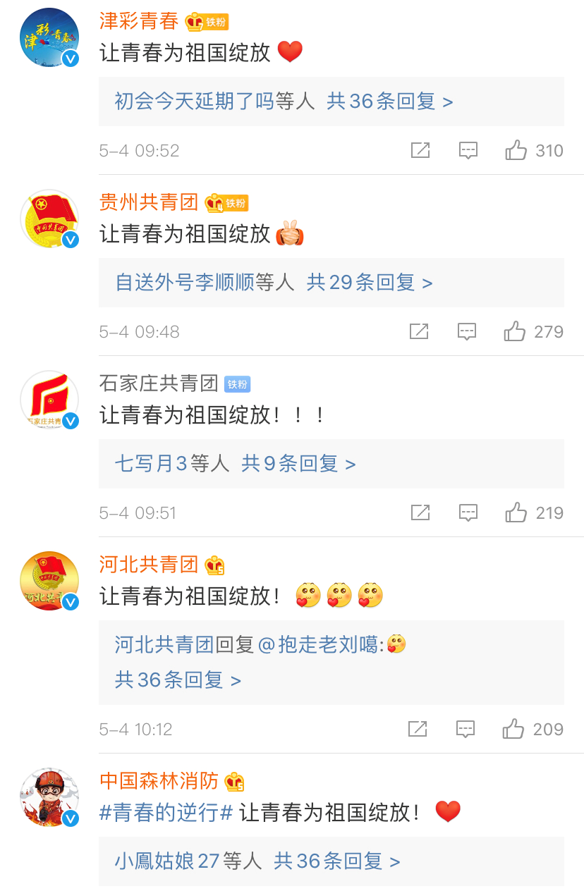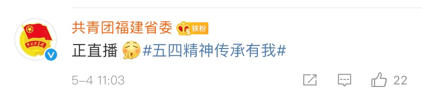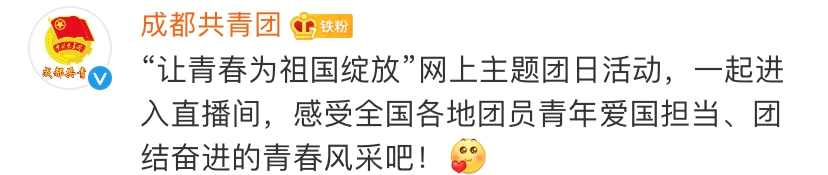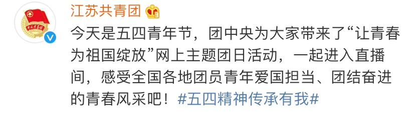 共青团中央也为全国青年准备了一份特别的青年节礼物。五四青年节当天,@共青团中央 在学习强国平台以及微博、微信、B站、快手、抖音、斗鱼、今日头条等各大网络平台,同步举办“让青春为祖国绽放”网上主题团日活动,连续11个半小时不间断网络播出,从上午10:00直播至21:33(其中“让青春为祖国绽放”直播至晚八点,随后接入央视“奋斗的青春最美丽”至晚九点半)。为大家送上了一次特别的团课!