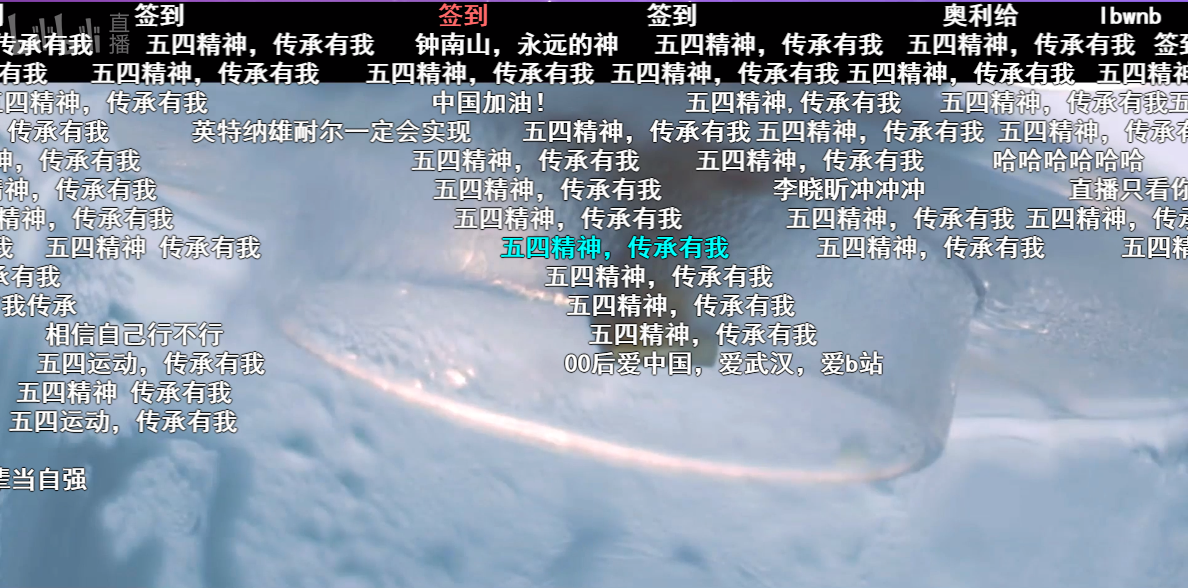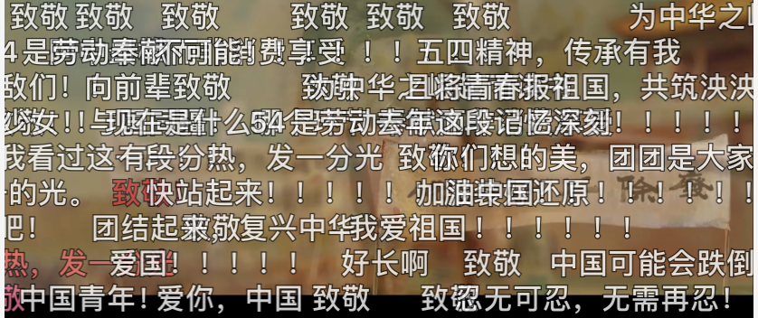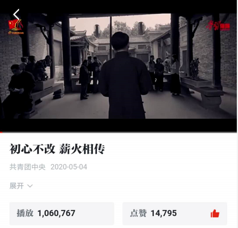 学习强国平台首次开放直播弹幕,满屏正能量。作品《初心不忘薪火相传》播放量100万、作品《少年》播放量近百万、作品《海外留学生:我深深地爱着这个国家》播放量近10万、《五四精神代代相传》等多个重点产品在推荐栏高位推荐,播放量累计超过150万。