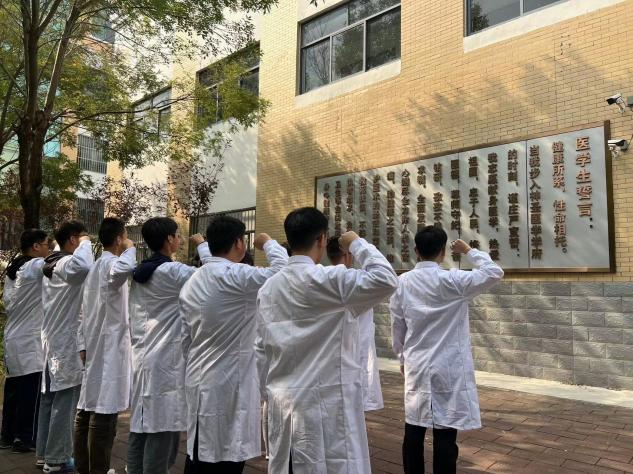 全体师生右手握拳,庄严宣誓。矢志誓言,铿锵有力,表达了献身医学的决心与不懈奋斗的信念。