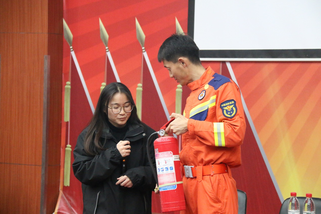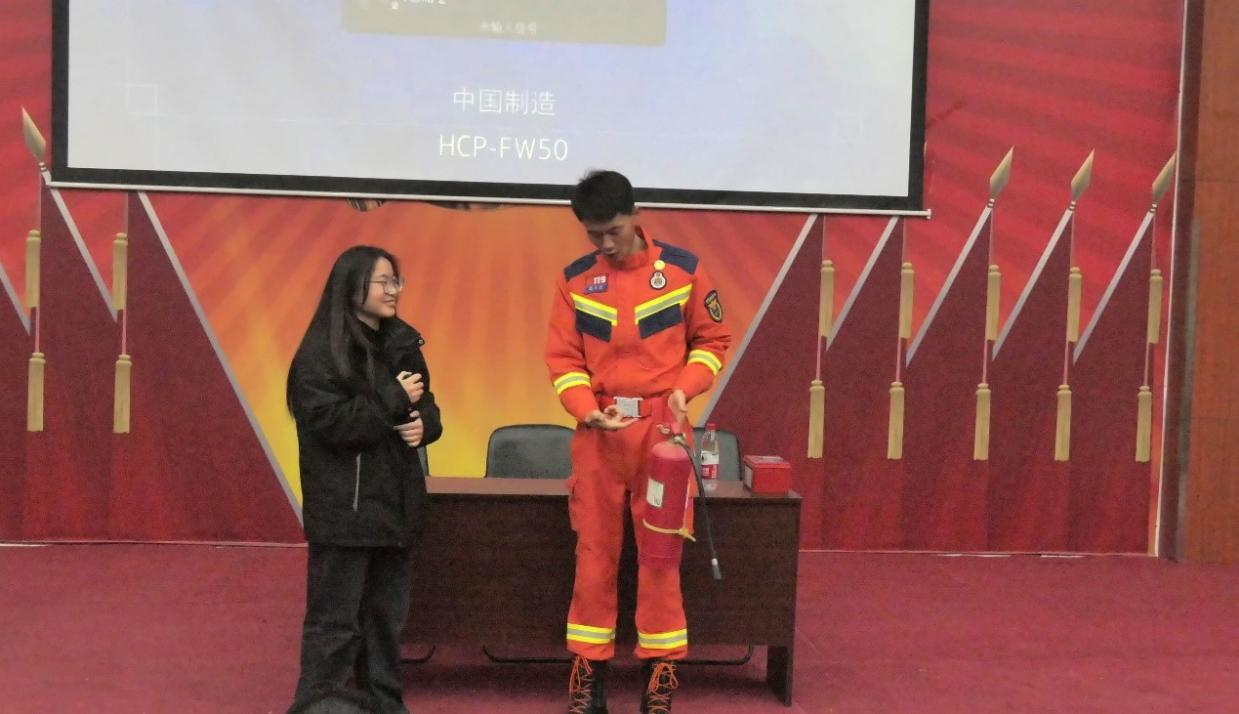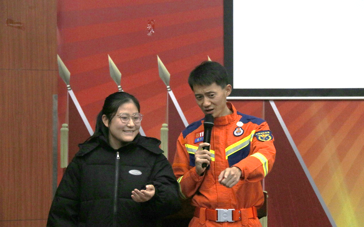 吴成海同志生动形象地结合火灾救援经典案例,详细地向同学们科普消防安全救援知识。当发生火灾时,不能贪恋财物,不在火场逗留;逃生时,应保持个人情绪稳定,沉着冷静,切勿手捏鼻子用嘴呼吸,应就地取材,根据火场实际情况,采取合理的逃生方式。注意打湿衣物,遮住口鼻,告诫同学们在日常生活中要注意安全通道,以防发生紧急情况时可以快速逃生,在逃生时不能乘坐电梯,要走安全通道。