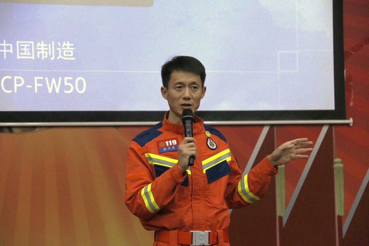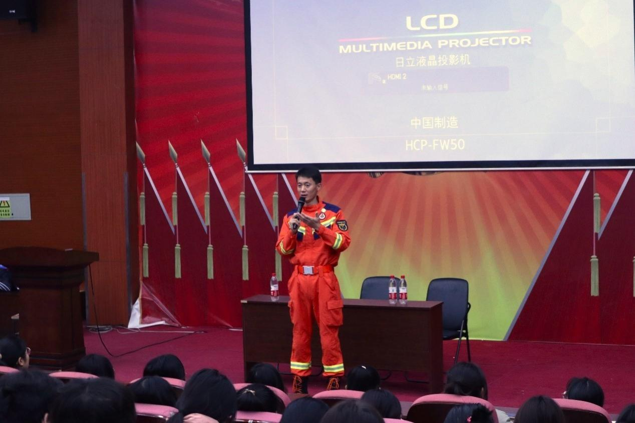 吴成海同志身着抢险救援服,向同学们叙述消防员的使命与担当,他们坚持有警必出,闻警必动,始终为人民服务,奋战在人民最需要的地方,让现代学子充分了解到消防员是永远奔赴在抢险救援的第一线,坚持以人身安全救援为第一位,为维护人民群众生命财产安全而英勇奋斗的战士们。