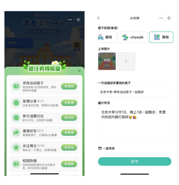 点击【领能量】按钮,选择【找搭子】任务项,发布寻找运动搭子帖,或向校内组队同学打招呼,共同完成运动打卡,记录运动日常。