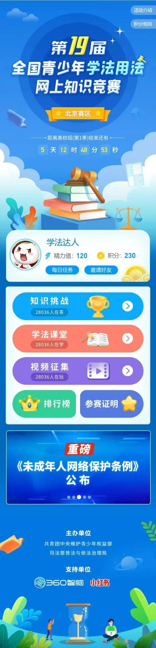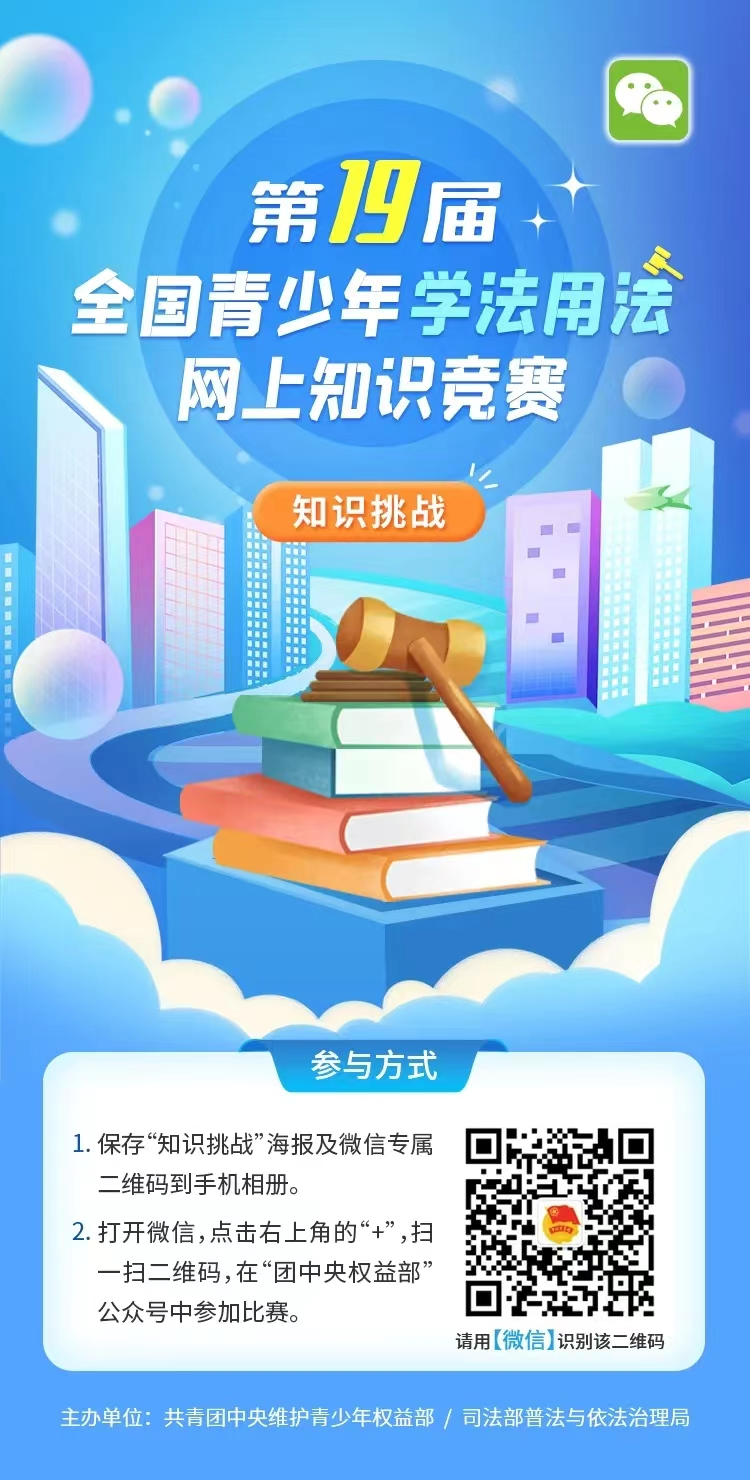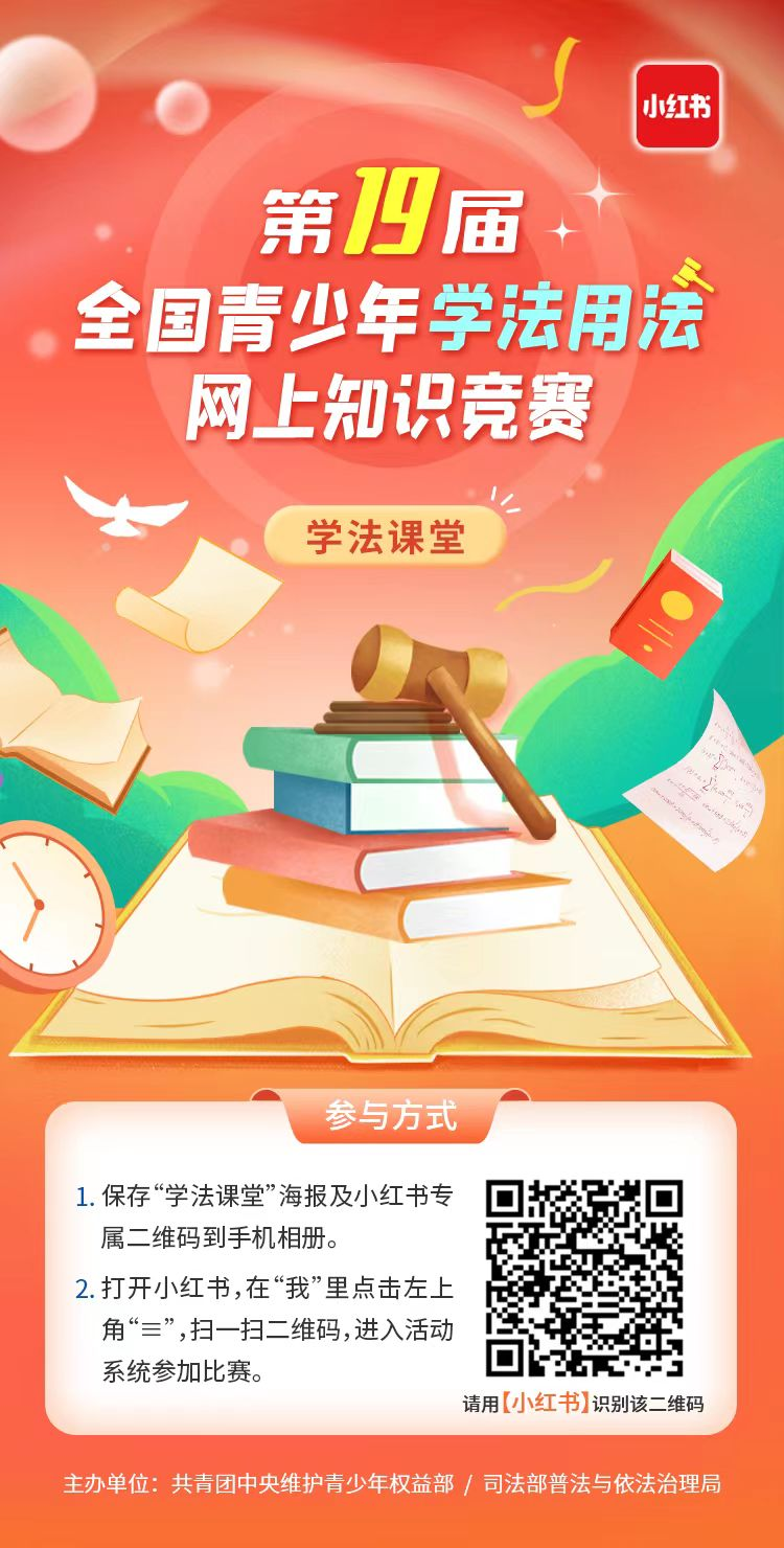 为全面贯彻党的二十大精神,认真实施共青团中央《关于贯彻实施“八五”普法规划 深入开展青少年法治宣传教育的意见》,引导广大学生尊法学法守法用法,弘扬社会主义法治精神,提高高校普法力度,增强全民法制观念,2023年11月10日起,由共青团中央维护青少年权益部、司法部普法与依法治理局联合主办的第十九届全国青少年学法用法网上知识竞赛正式启动!
