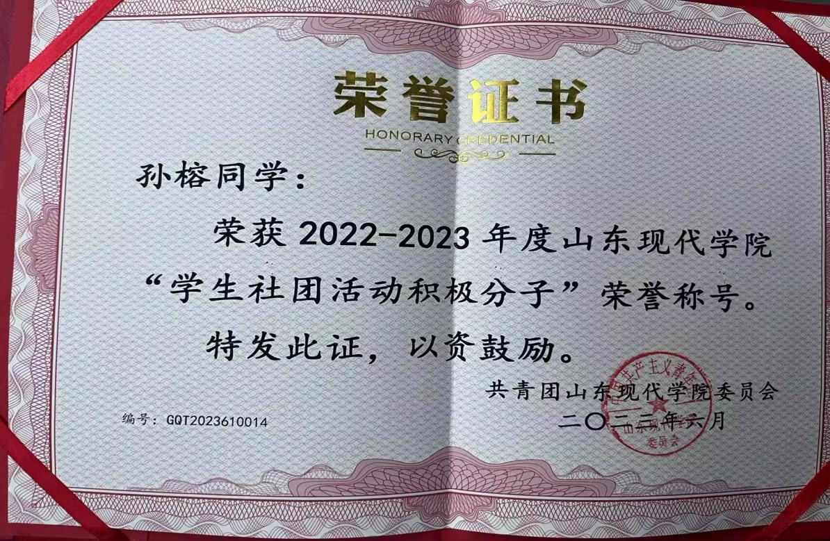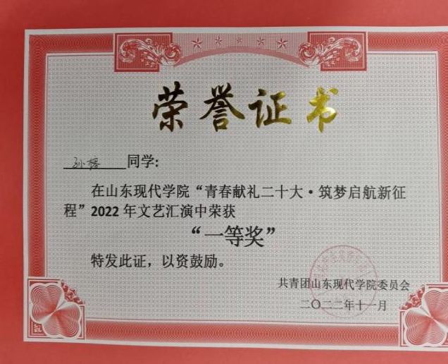 个人简介:孙榕,女,汉族,共青团员,2022级本科护理学7班。在校团委大学生艺术团任职,工作认真负责、严谨细致,积极参加学校组织的各类活动和比赛,曾获得“手语舞大赛”二等奖,“红歌比赛”二等奖、山东现代学院“社团活动优秀积极分子”等荣誉。