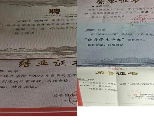 个人简介:祝鹏辉,男,汉族,中共预备党员,2020级本科中药制药2班。现担任班里班长一职,曾任药学院自律委员会主席一职,积极协助学院领导及辅导员完成各项工作,对工作认真负责,待人和善。在校期间积极参加学校组织的各项活动和比赛,曾荣获山东现代学院“最美现代学子”“校级优秀学生干部”等荣誉。