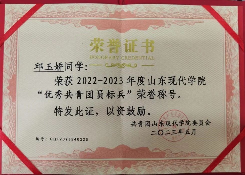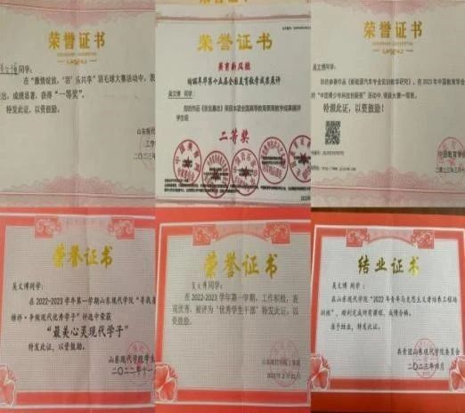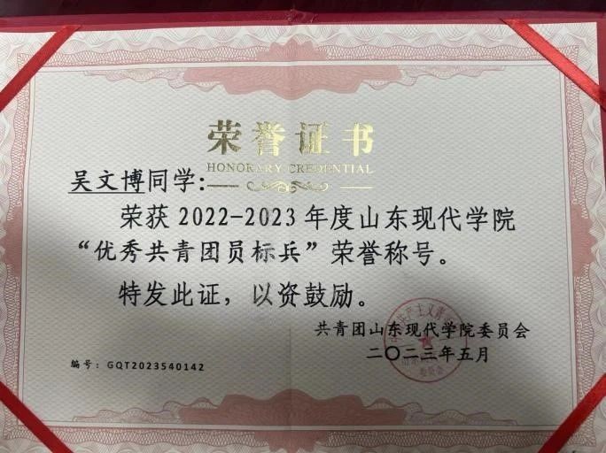 个人简介:吴文博,男,汉族,共青团员,2021级本科汽车服务工程2班。在班里担任团支书一职,同时在工学院学生会担任轮值主席一职,工作积极进取、严谨认真;积极参加各类比赛活动,曾获得“激情绽放·‘羽’乐共享”羽毛球大赛一等奖、山东现代学院“优秀学生干部”“最美心灵现代学子”等荣誉。