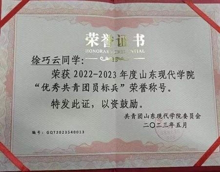 个人简介:徐巧云,女,汉族,中共预备党员,2021级本科助产学1班。在校团委任职,工作认真负责,充分发挥表率作用;学习上求实效,政治上求先进,多次参加学校组织的活动,积极参加各种比赛,曾获得山东省青少年规划项目大学生课题立项证书、“省级优秀学生”山东现代学院“最具风采现代学子”等荣誉。