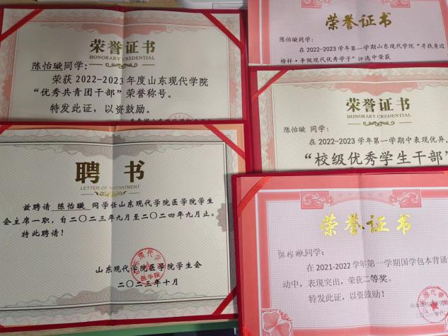 个人简介:陈怡璇,女,汉族,中共预备党员,2021级本科医学检验技术2班。在班里担任宣传委员,同时在医学院学生会任职,工作上责任心强、踏实肯干,思想上积极向党组织靠拢,积极参加志愿实践活动,志愿时长达123小时,学习上明确目标、勤奋刻苦,曾获得山东省大学生科研项目立项证书、山东现代学院“最美学习标兵”、“校级优秀学生干部”等荣誉。