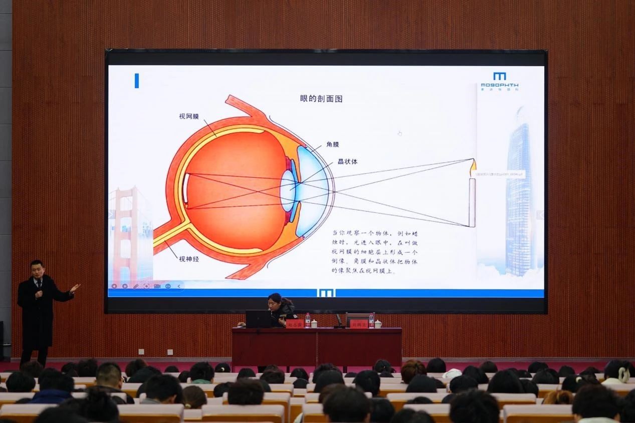 近日,济南麦迪格眼科医院业务院长赵志国向同学们讲解了眼睛在生活中的重要作用、眼球的结构及原理、近视的形成及预防等内容。赵老师强调,在日常生活中学子们一定要注意用眼卫生,保持充足的睡眠,养成良好的饮食习惯,积极树立爱眼、护眼意识,养成良好的用眼习惯。