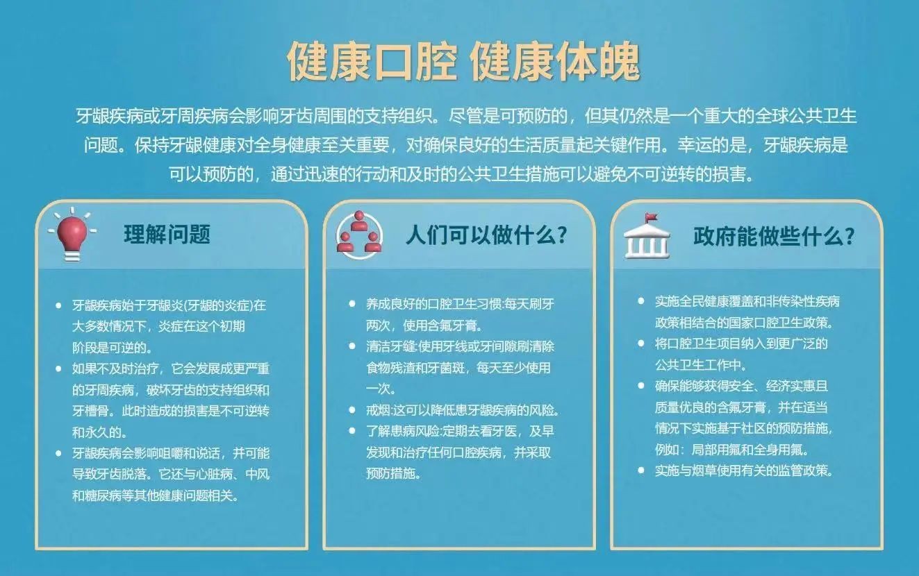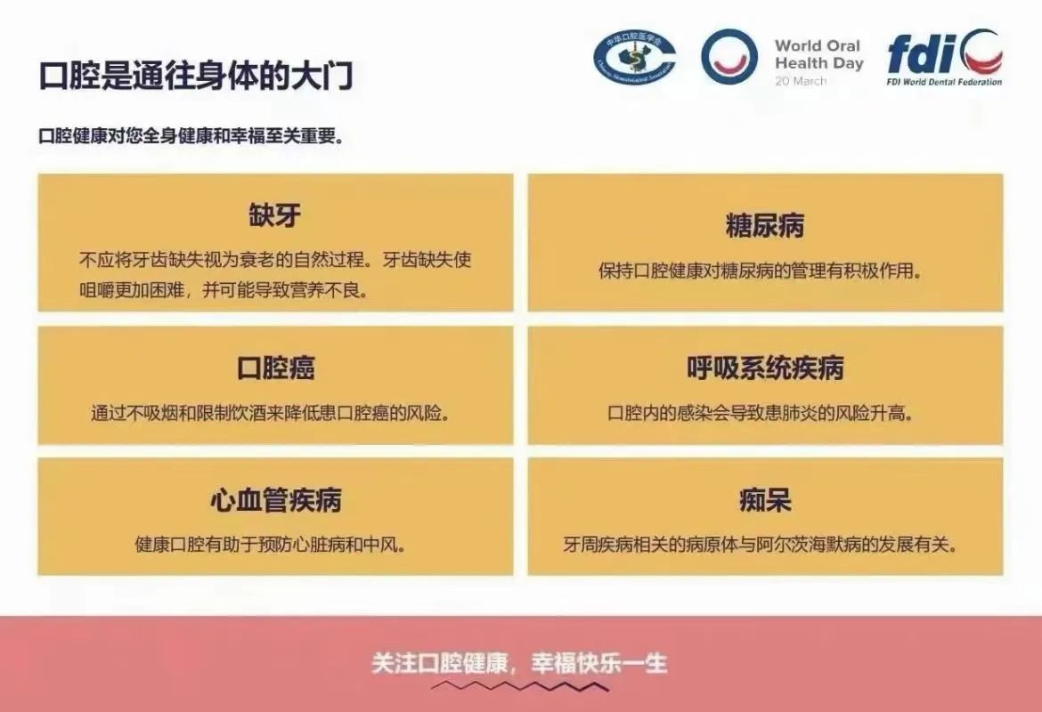 2024年是第17个“世界口腔健康日”,世界牙科联盟(FDI)将正式发起一场为期3年(2024-2026)的宣传活动,以“健康口腔,健康体魄”为主题,重点关注口腔健康与全身健康的紧密而复杂的联系,在全球范围内倡导和鼓励人们对自己的口腔健康更加负责。