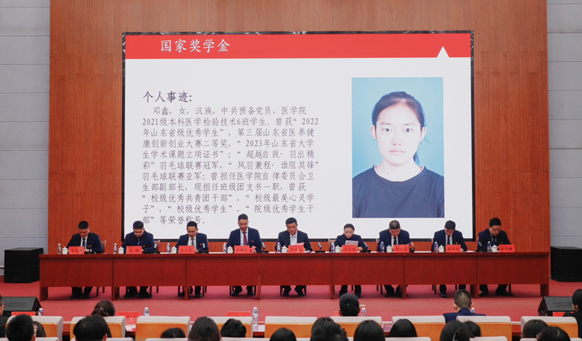 学生处处长刘锦绣同志宣读关于表彰2023学年国家奖学金、省政府励志奖学金等六类奖学金的决定,并颁发证书。