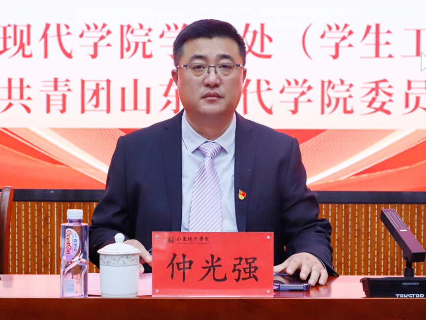 山东现代学院党委委员会统战部部长仲光强同志作总结发言,首先向受到表彰的师生表示了祝贺,肯定了我校学团工作取得的成绩。其次,他对现代学子提出了三点期望:一要汲取“请党放心,强国有我”的前进力量,争做对党忠诚的追梦人;二要汲取“生命不息,学习不止”的前进力量,争做学以致用的追梦人;三要汲取“志不求易,事不避难”的前进力量,争做作风过硬的追梦人。