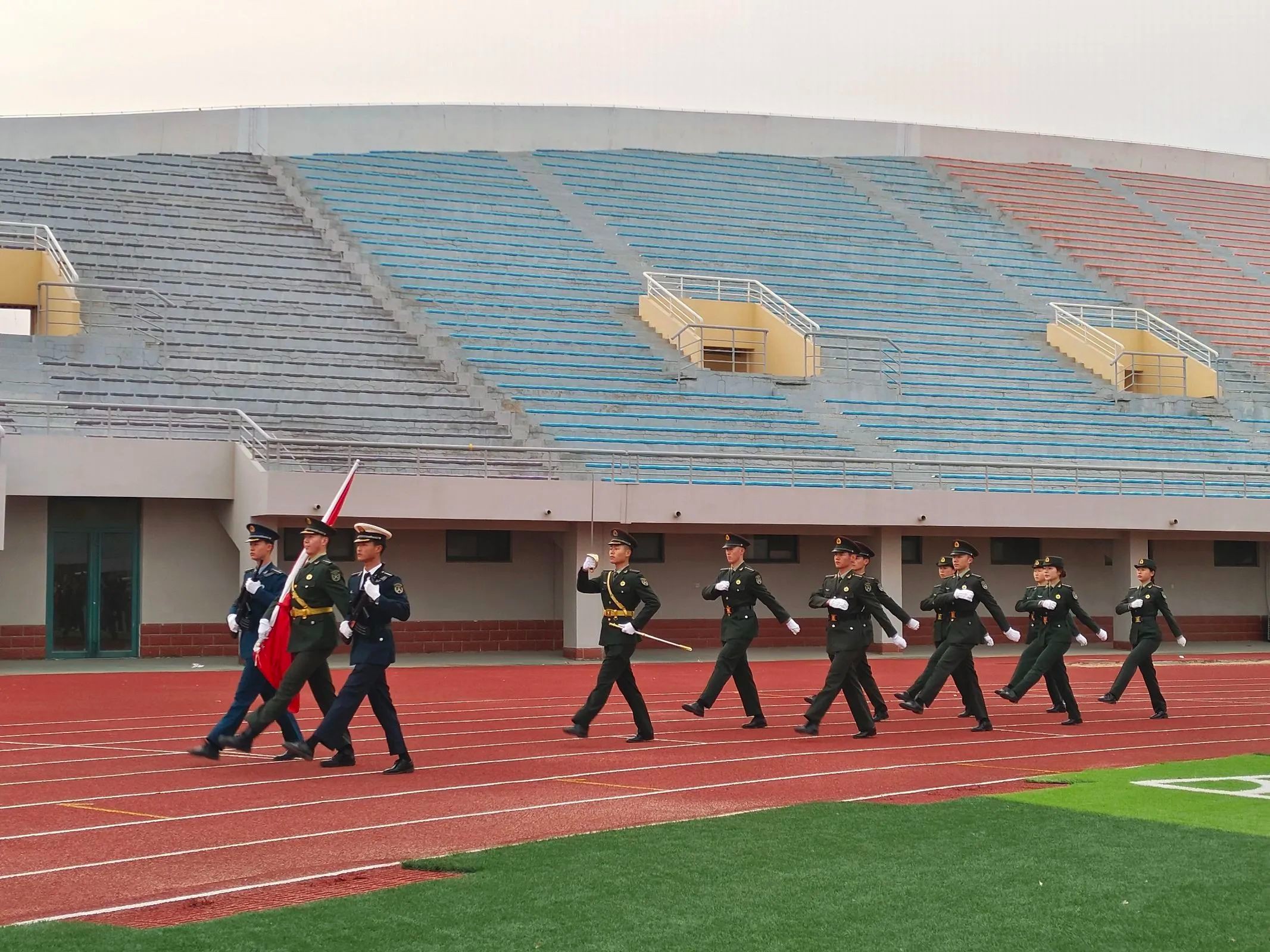 国旗仪仗队迈着整齐划一、铿锵有力的步伐,护送着五星红旗正步走向旗杆。全体师生面向国旗肃立致礼。迎着清晨的第一缕阳光,在雄壮的国歌声中,师生们注视着五星红旗冉冉升起,在熠熠晨光中迎风飘扬。