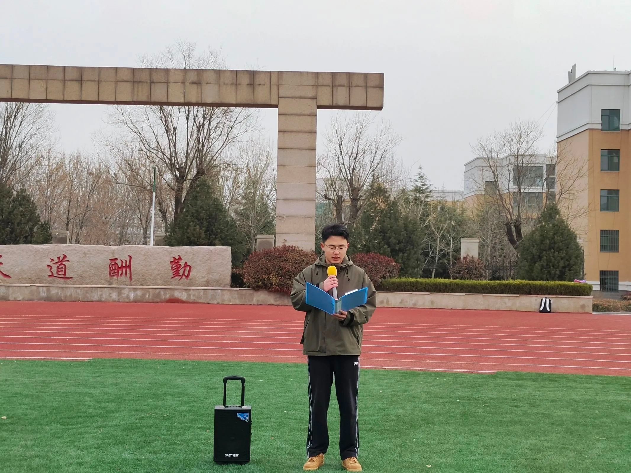 仪式进行第二项:由学生代表张一桢带领全体同学学习《山东现代学院学生安全告知书》。