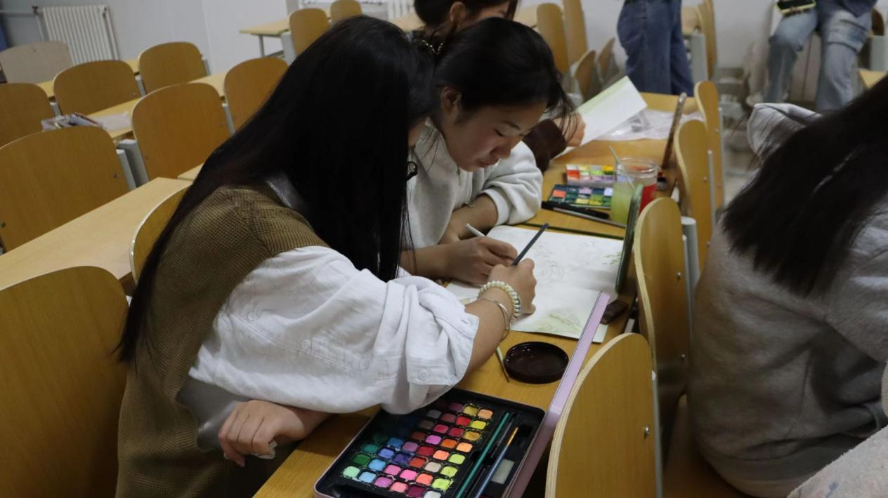 活动现场,同学们以多样的绘画方式进行创作。他们或以国画技法展现山水之美,或以水彩描绘传统节日的热闹场景,或以素描呈现古代文人的风采。